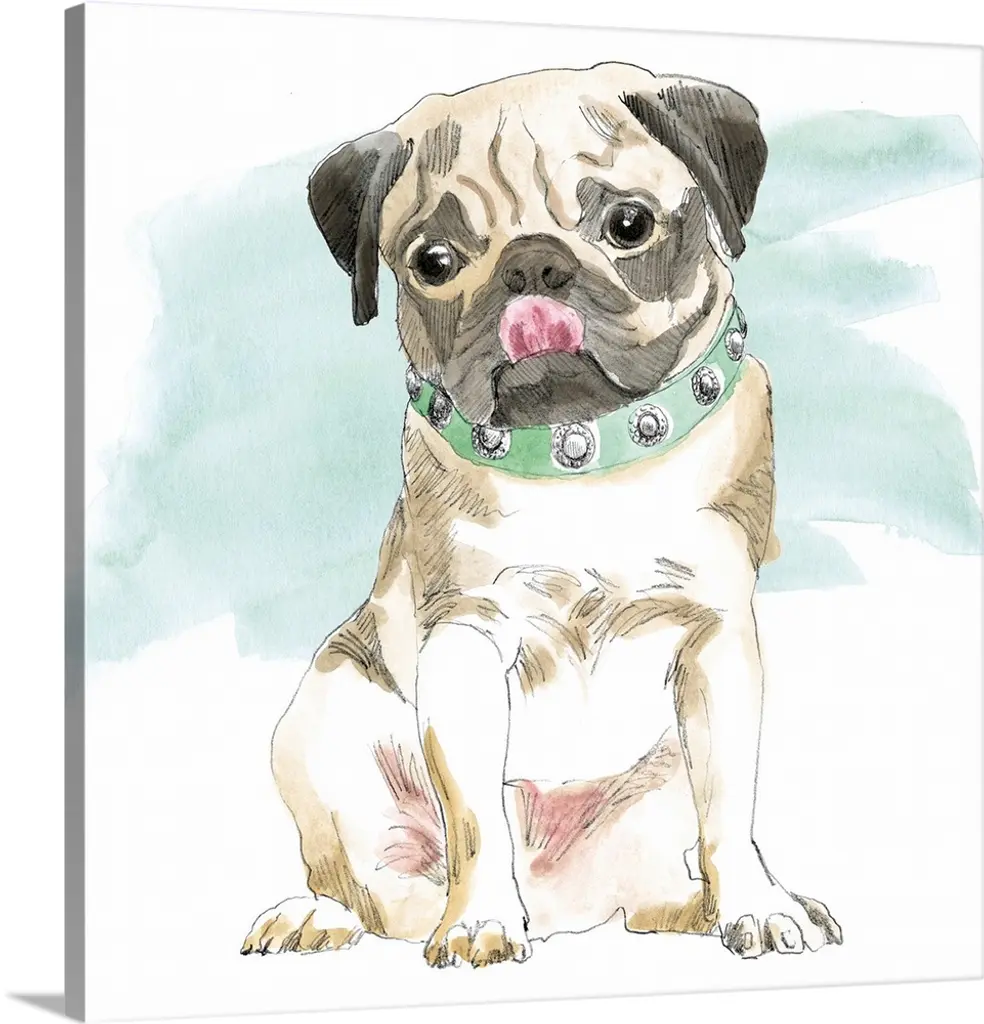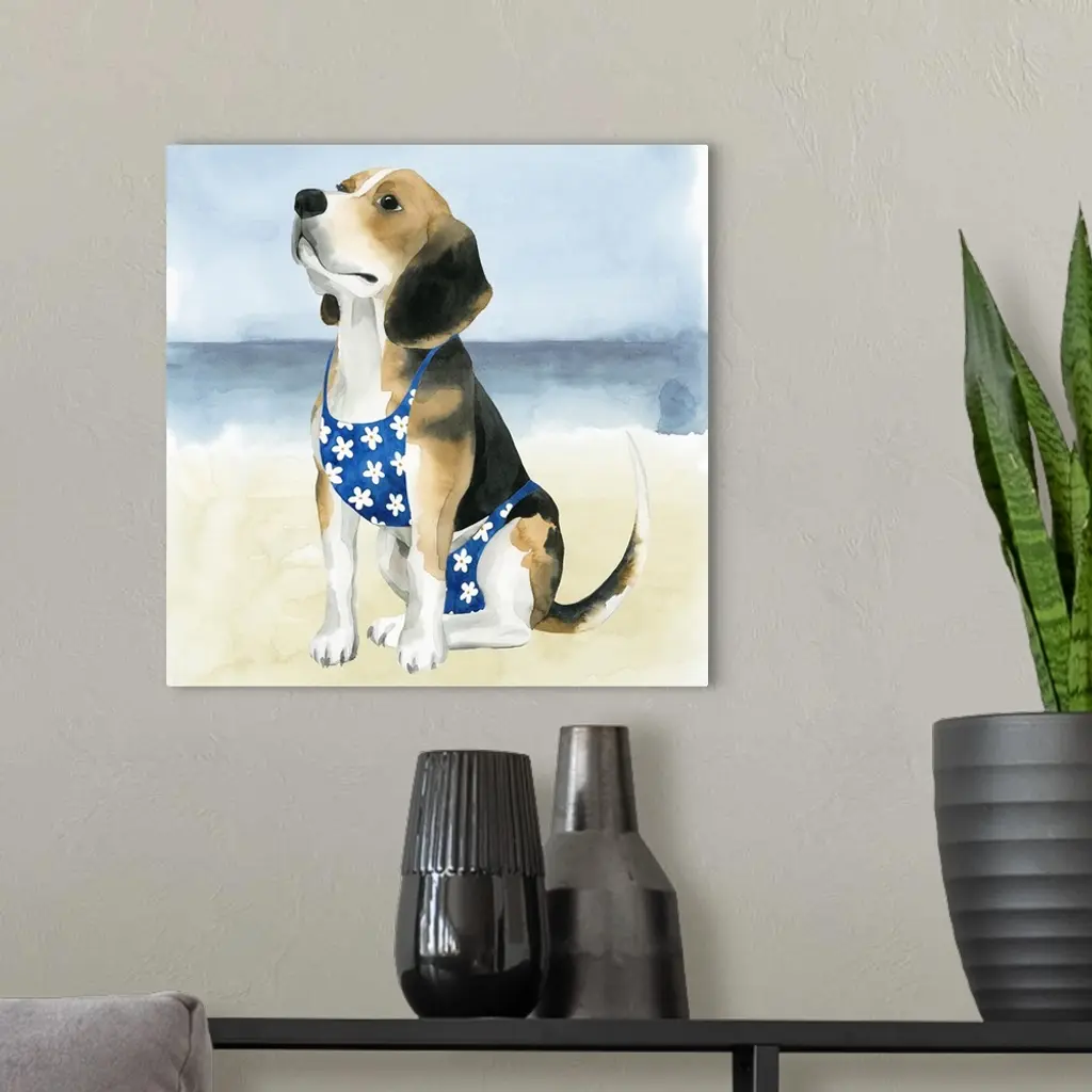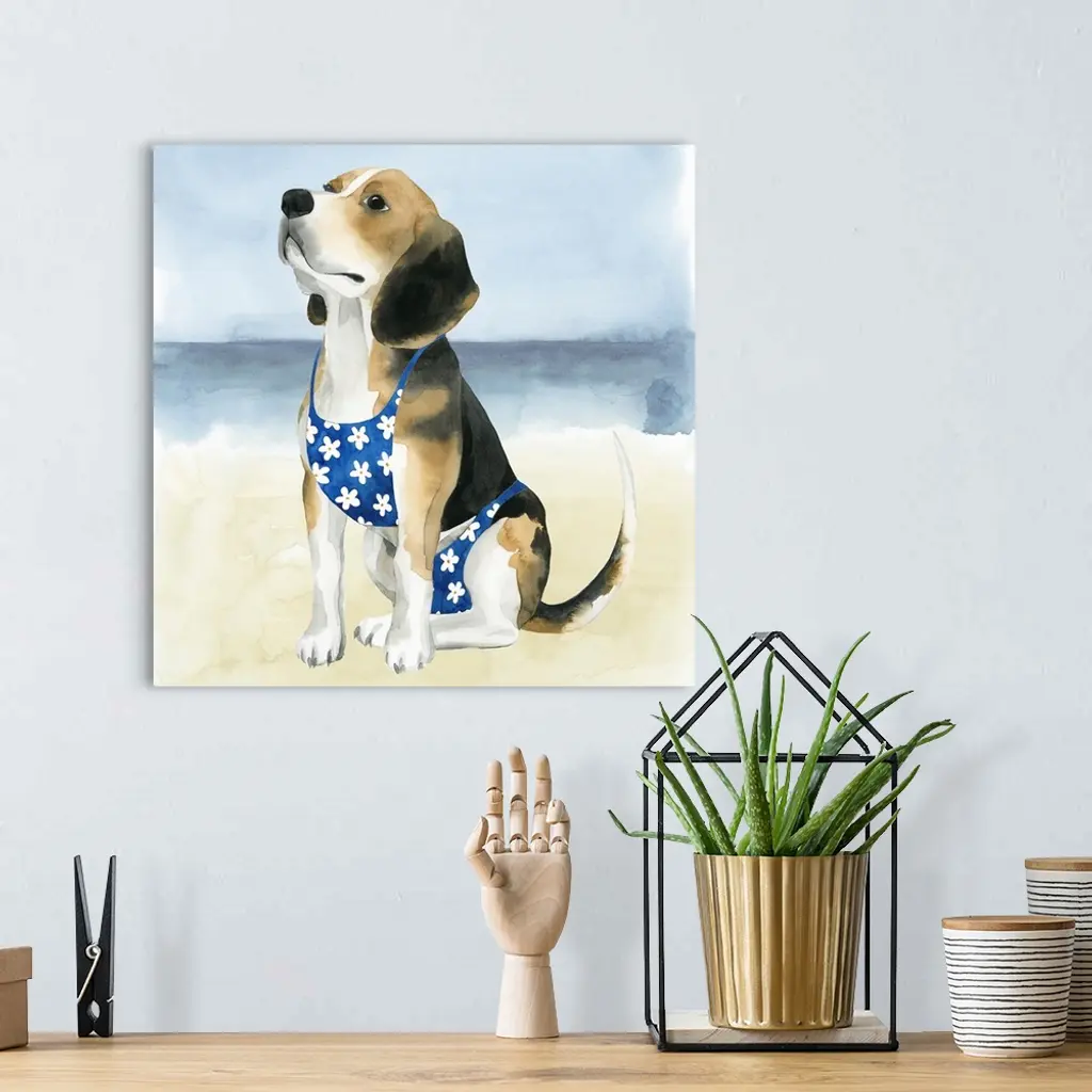 Square watercolor painting of a beagle wearing a bathing suit on the beach.