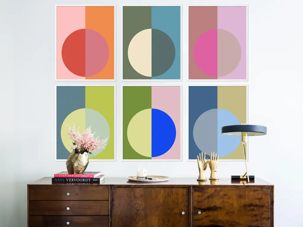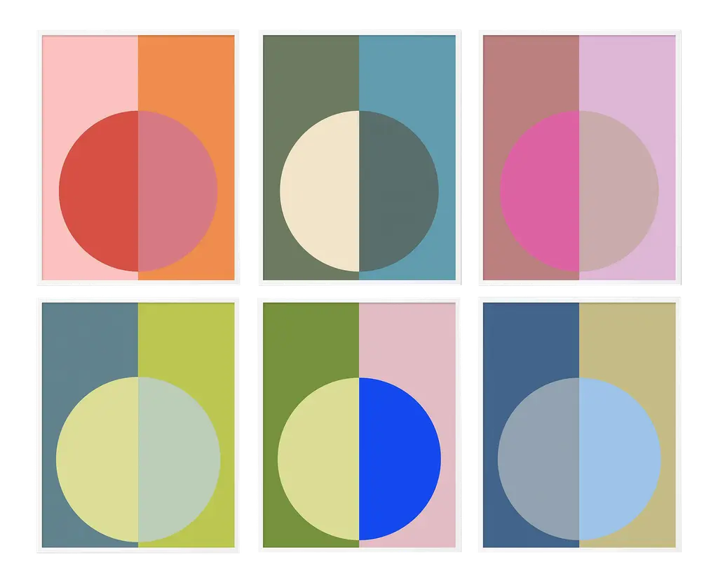 DESCRIPTION: Hot Forevers Set of 6 by Stephanie Henderson in White Frame, Medium Art Print SPECIFICATIONS: Type: Framed Paper. Individual Frame Size (in): 28.5x36. Orientation: Vertical. Flush/Float/Matted: Flush. Frame Color: White. Hanging Hardware: Picture Perfect. 6 pieces are included with this purchase. Overall set dimensions as pictured: 85.5x72. FRAMING: Each art work arrives framed and ready to hang. We use handmade frames with a plexiglass glazing front, because it offers less glare than standard glass. At this time, we only offer framed prints. ARTIST BIO: Stephanie Lear Henderson is a painter living in Ponte Vedra Beach, Florida. Her work can be found in collections throughout the US and Canada. Working primarily in hard-edge abstraction, she also occasionally paints representational works in oil. A native of Thomasville, Georgia, Stephanie earned a B.A. in English Literature from the University of Virginia and an M.A. in Journalism from the University of Georgia. Stephanie’s work revolves around bold, saturated color and how colors communicate with each other and affect the observer. Her paintings contain forms that are simple, allowing the colors to express themselves without complications. Stephanie’s work reveals focus, precision, and an insatiable appetite for evocative combinations of color. She revels in the challenge of painting perfectly clean lines freehand with a brush. No tape. No masking.Stephanie embraces the belief that color alters mood, outlook, and brings absolute joy to life. Stephanie's artwork has appeared in a multitued of publications including House Beautiful and The CUT.
