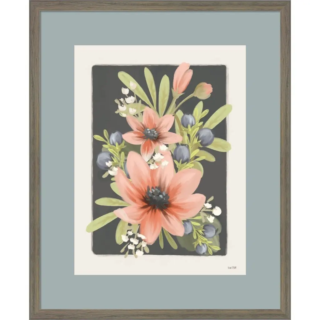 Floral Blueberries I by House Fenway is a high quality piece of framed artwork. The finished size of this piece is 18" X 22". It has a Distressed Grey Knotty Wood frame, is single matted and finished with high quality Acrylic Plexiglass. 100% Satisfaction Guaranteed.