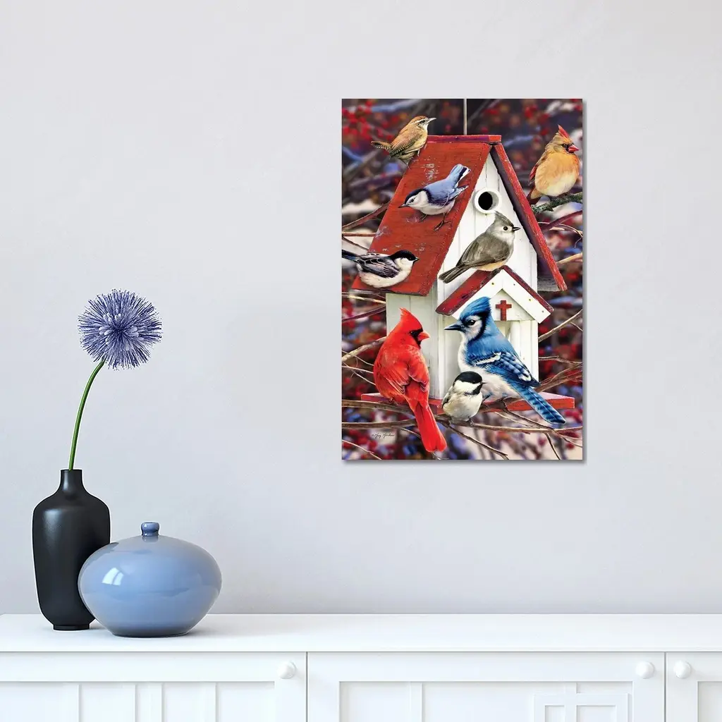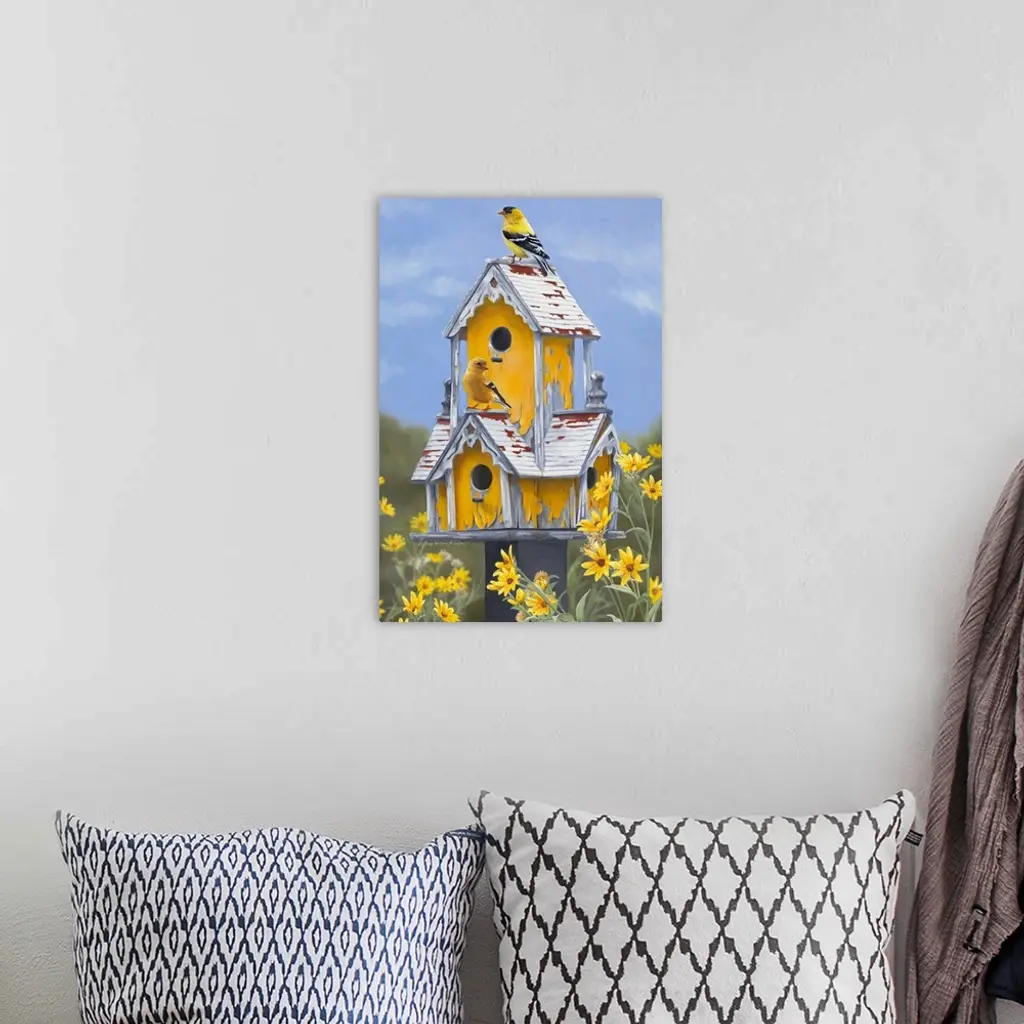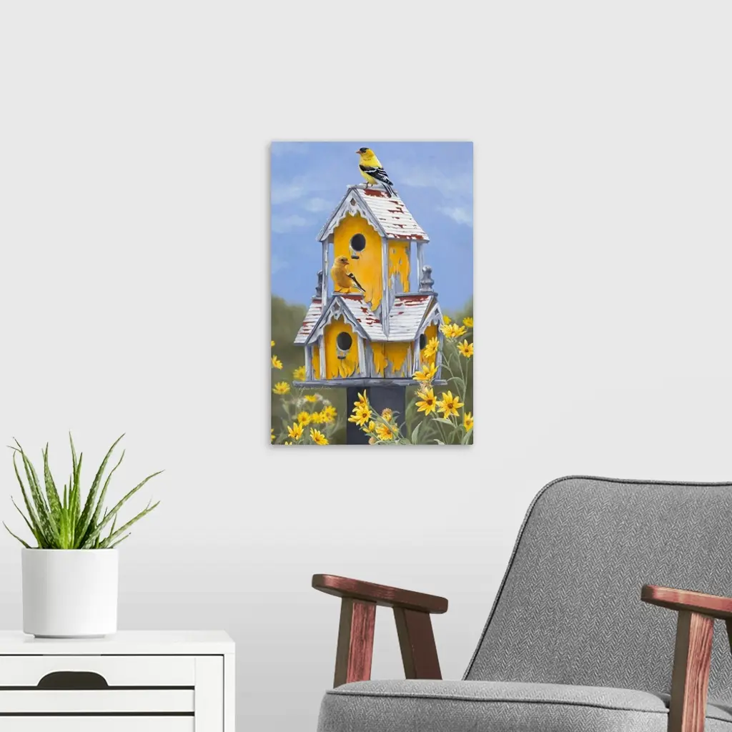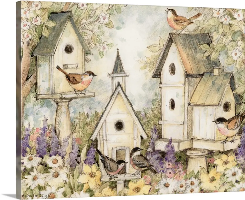 This is a photorealistic painting of garden birds on a bird house with distressed paint surrounded by color coordinated flowers.