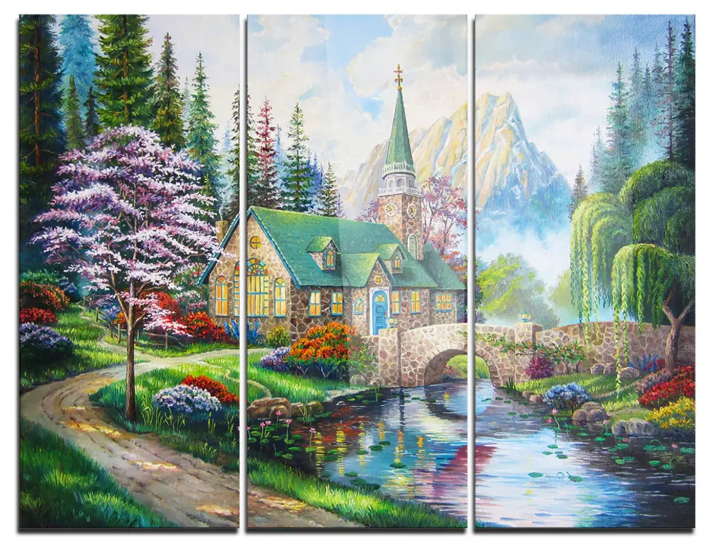 "House Near The Lake Swans" Glossy Metal Wall Art, 3 Panels, 36"x28"