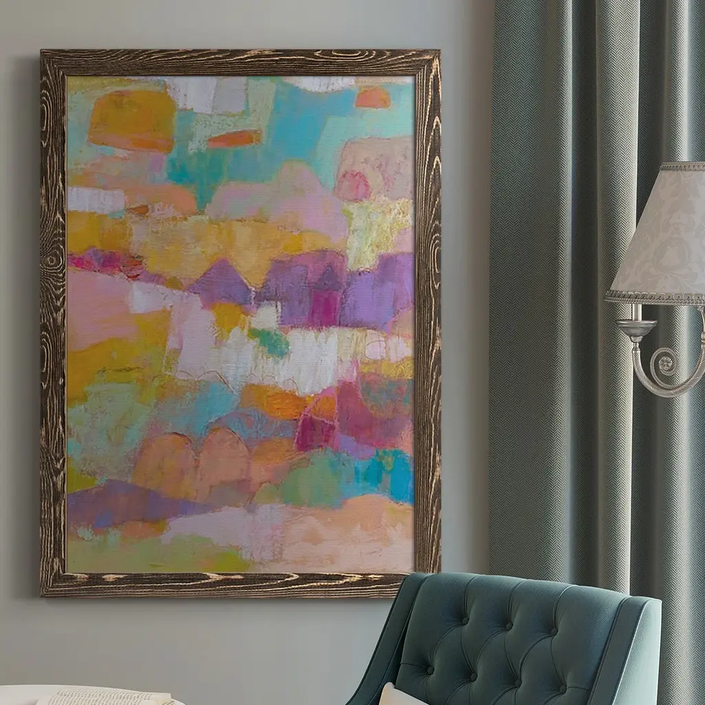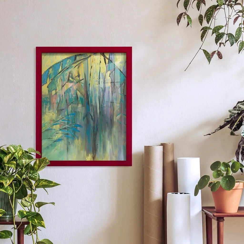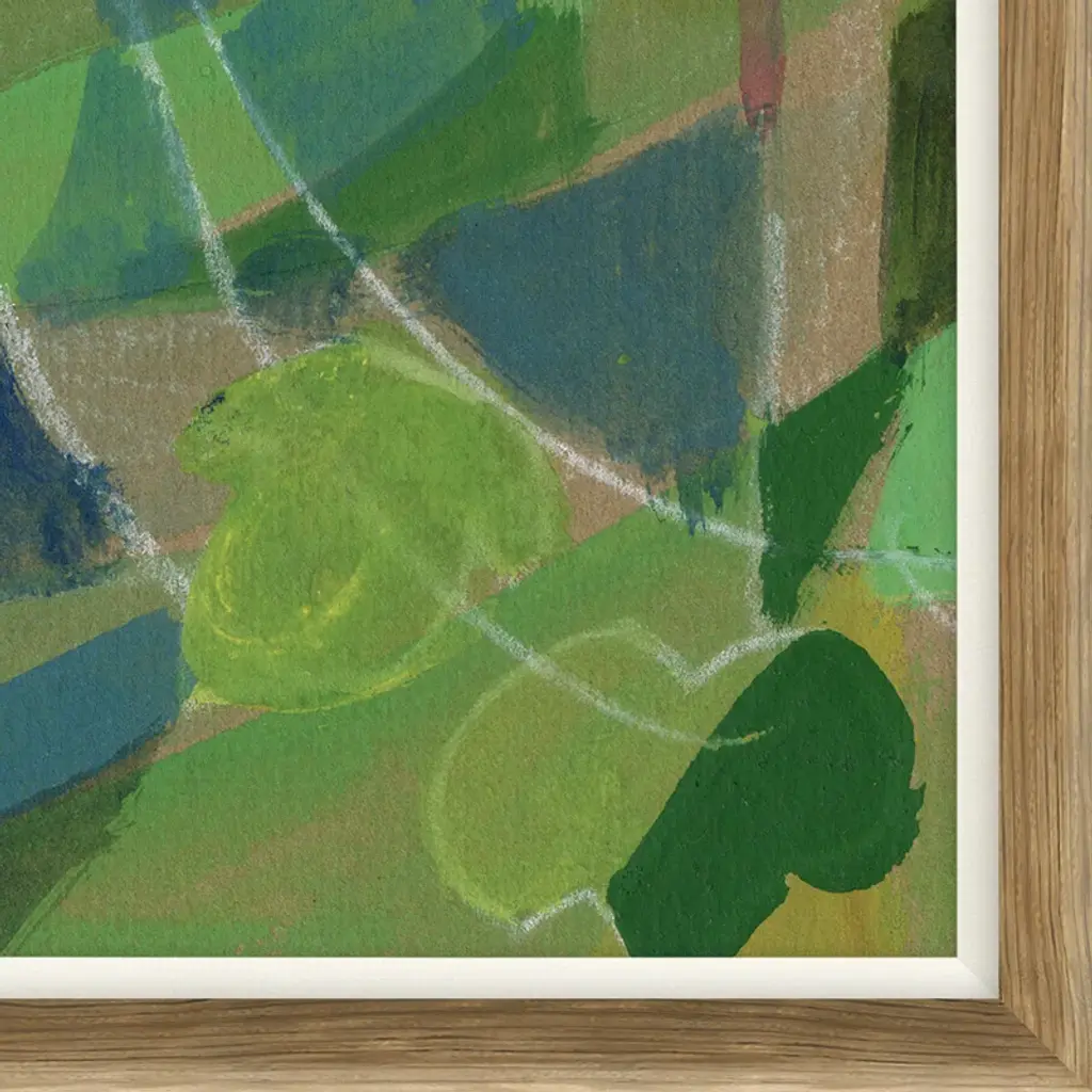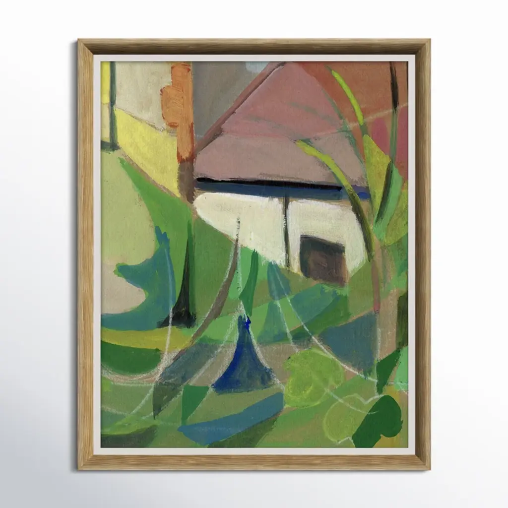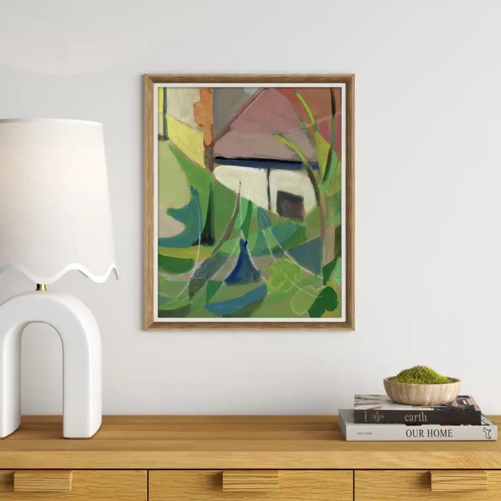 Ready to curate your gallery wall? Start with this acrylic painting print on paper, which showcases an abstract scene of a woodland cottage in green, pink, and blue hues. We especially love how the smooth curves and earthy color palette add visual interest to your living room, bedroom, or office walls without overwhelming your decor. This painting is made to order using archival inks to prevent fading, and it's set in a wooden frame for an elevated look.