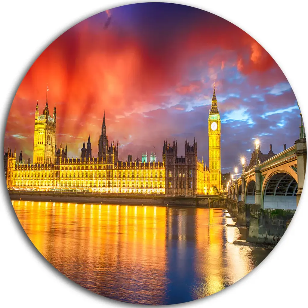 Bring Contemporary Abstraction to your home with this large Circle Metal wall art. This House of Parliament at River Thames Metal Artwork makes it the focal point of any room or office. - White Gloss Coating ensures colors are extra vibrant with light reflection.- Aluminum grade Sheet Metal with 1 inch mounting frame on the back giving the illusion that the artwork is floating on the wall..- Mounting Brackets are included along with instructions.- High Quality Digital images are created directly into a glossy aluminum panel producing a stunning and captivating print into the glossy finish of the metal.- Water, Fire and Scratch resistant HD Aluminum panels.- Looks better than any photo paper and guaranteed to last at least 20 years- Easy to clean with a microfiber cloth. Colors are far superior to regular Canvas Art. - Easy to Hang