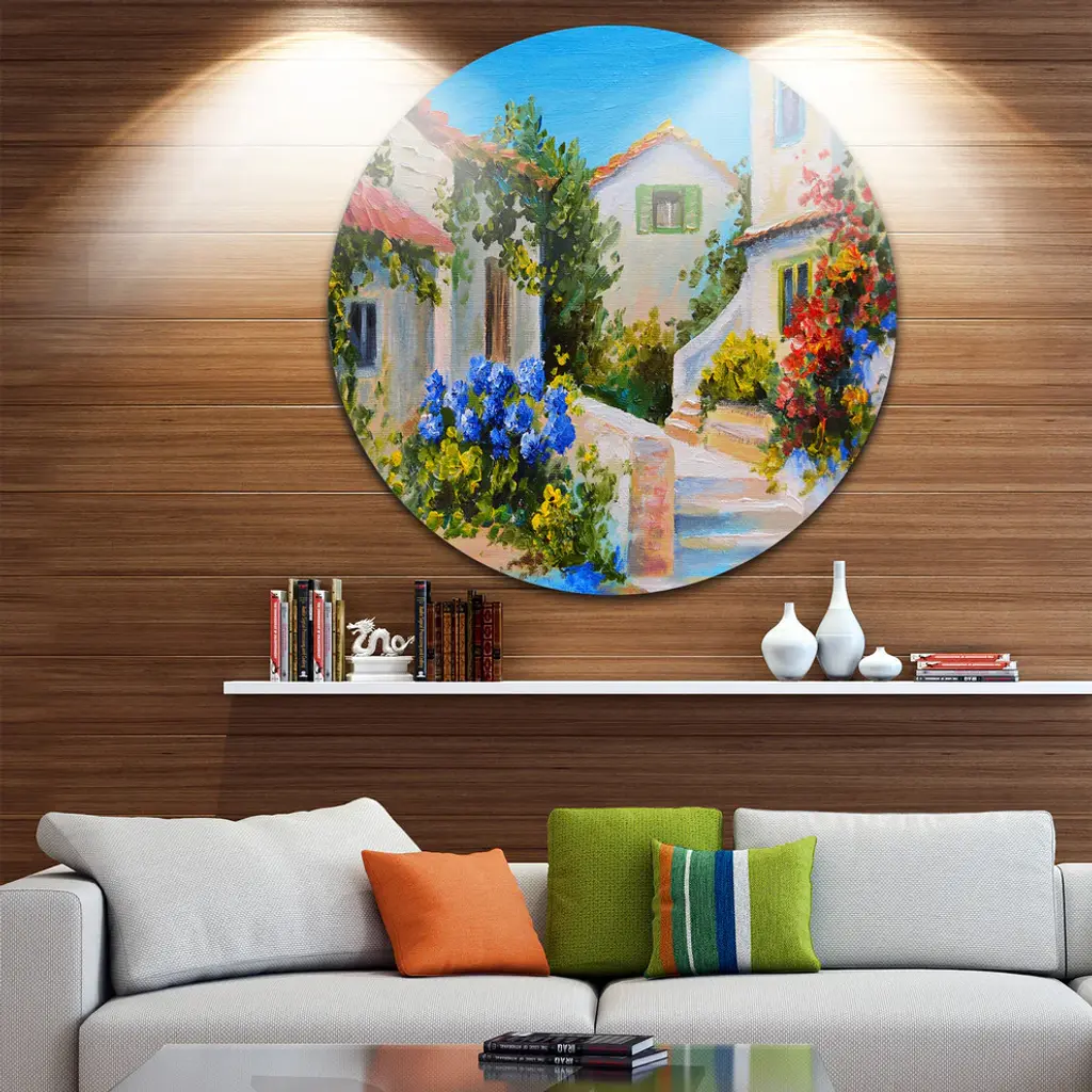 Houses Near Sea, Landscape Disc Metal Artwork, 36"