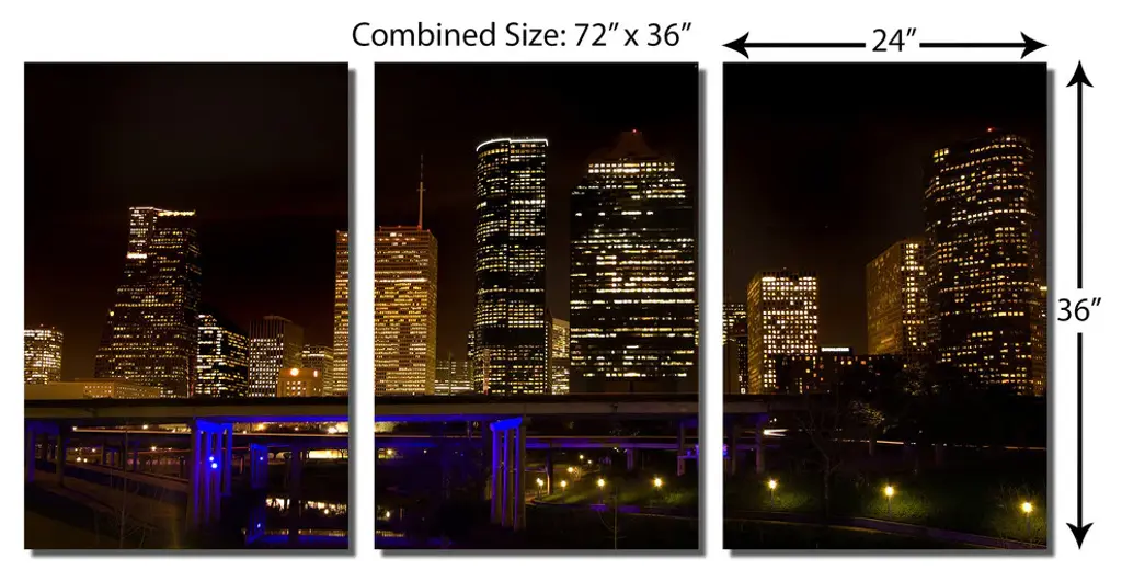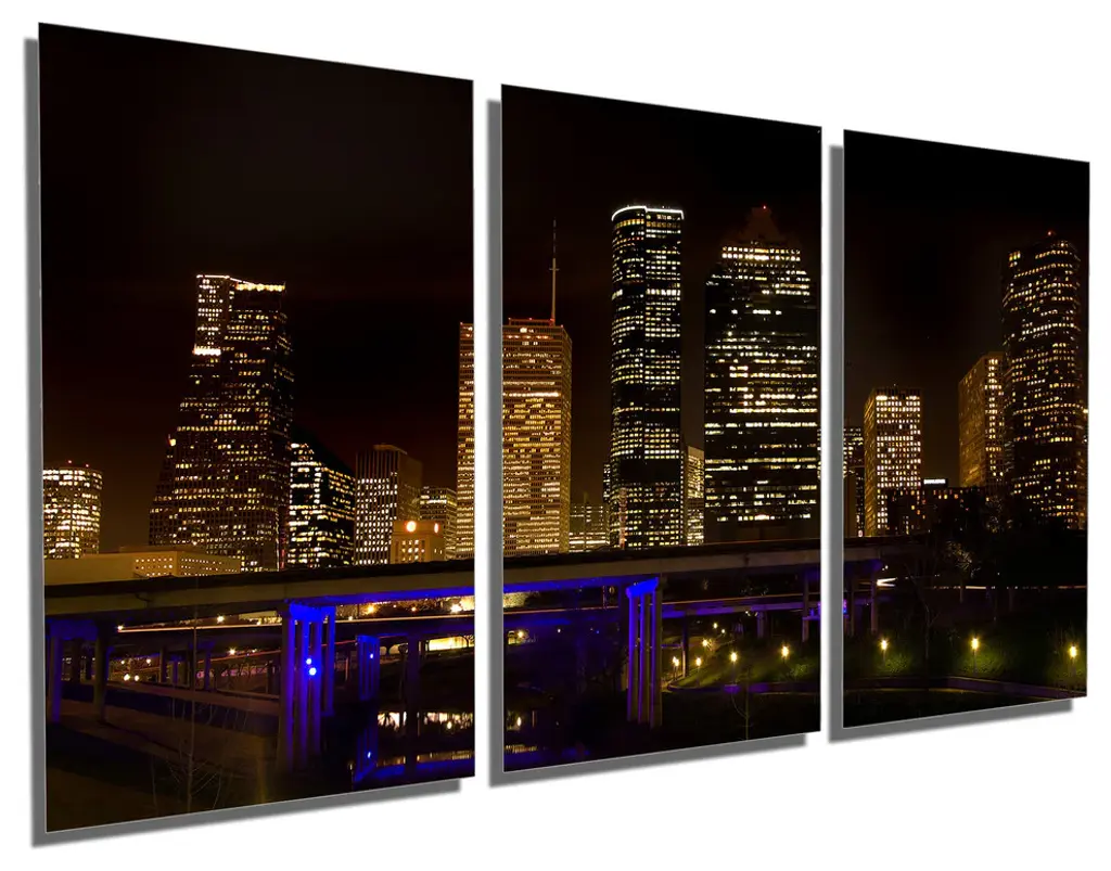 72"œ x 36"œ total size. Ready To Hang! (3 pieces - 24"œ x 36"œ each). 3 Panel Split (Triptych) Metal Print of Houston, Texas Skyline at Night. Modern metal wall art for home or office wall decor & interior design. Printed on Luxurious, HD aluminum glossy metal panels. Multi panel art.. HD aluminum panels. Metal print wall art. Includes Shadow Wall Mount on the back.• Aluminum Metal Wall Art• Made in USA• Ready to hang - No assembly required• Shadow mount hardware on the back• 0.045"œ thick HD Aluminum Panels• Scratch resistant, glossy finish• Superb color clarity, luxurious prints• Epson printing process• For indoor or moisture rich environment use• Easy to clean. Gently wipe with microfiber cloth.