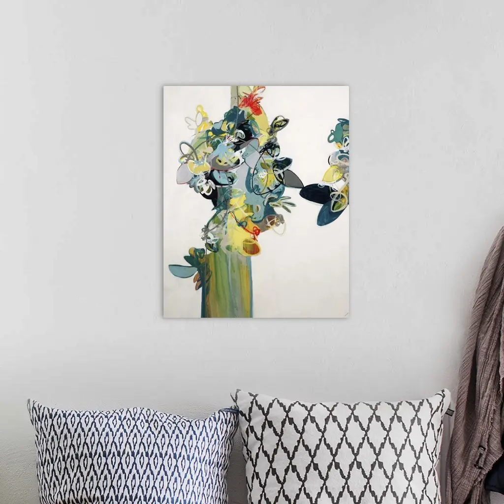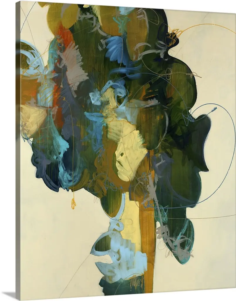 Contemporary abstract painting colorful obscure shapes against a neutral background.