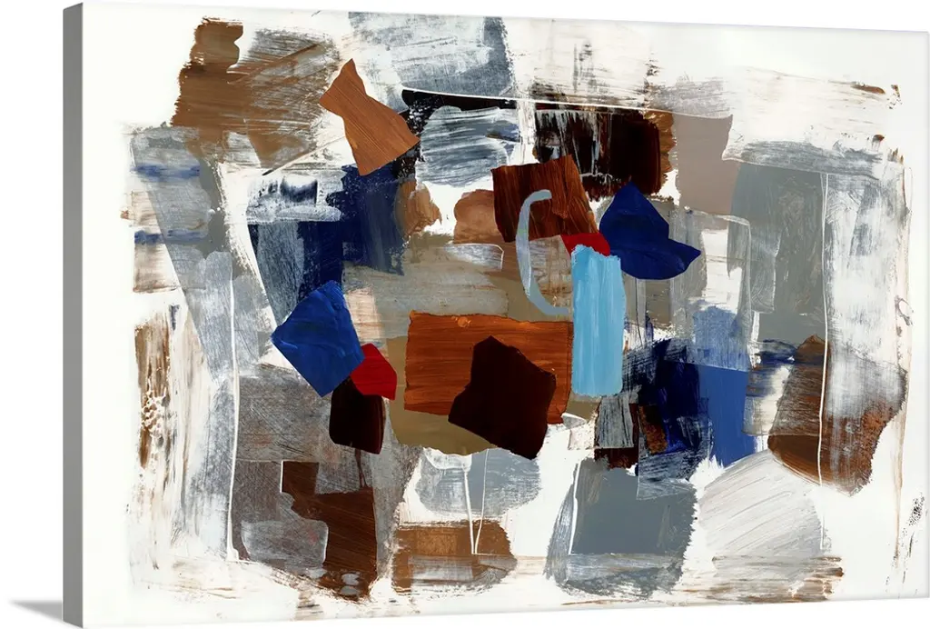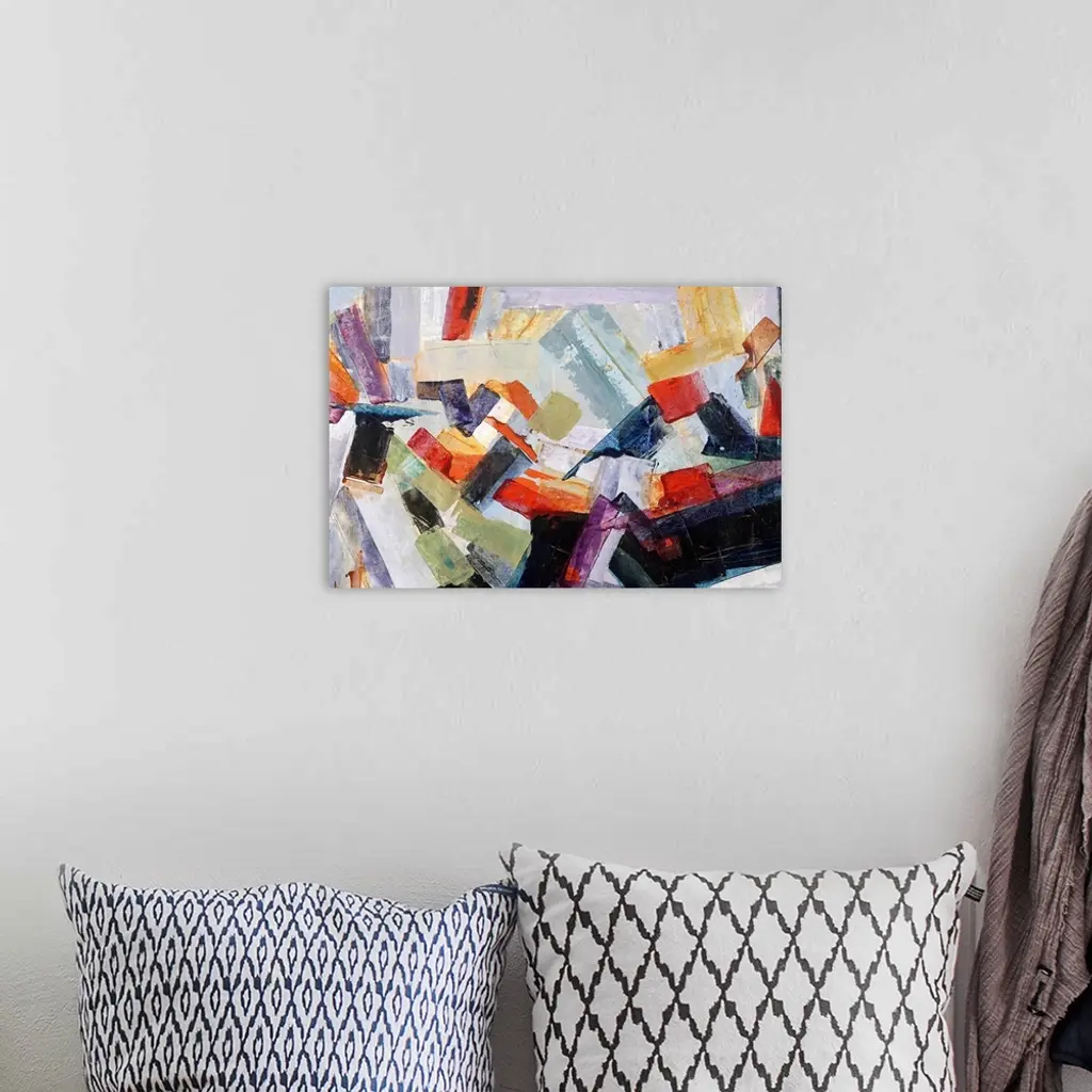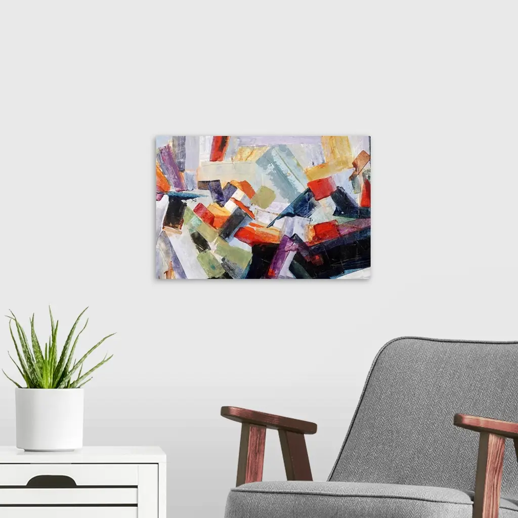 Large abstract painting with thick, angled, brushstrokes of color moving in all directions and layered on top of each other.