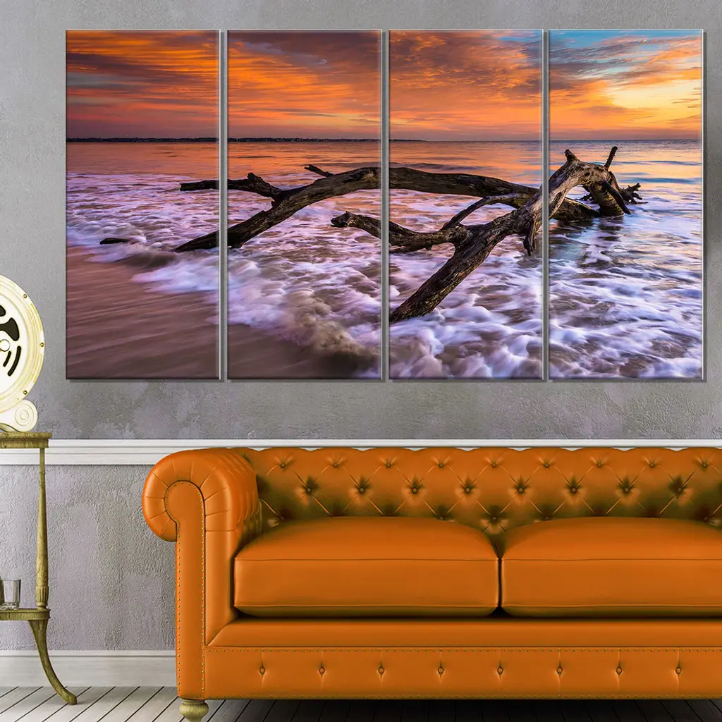 "Huge Branch Of Tree At Seashore" Beach Canvas Wall Art, 4 Panels, 48"x28"