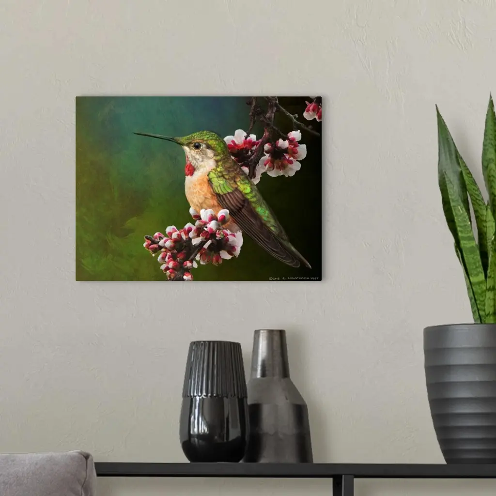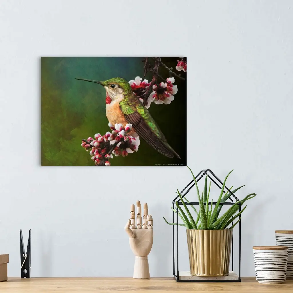 Contemporary artwork of a hummingbird perched on a tree branch.