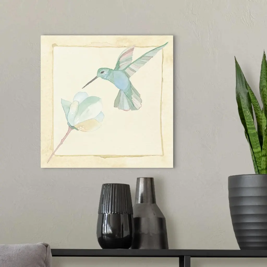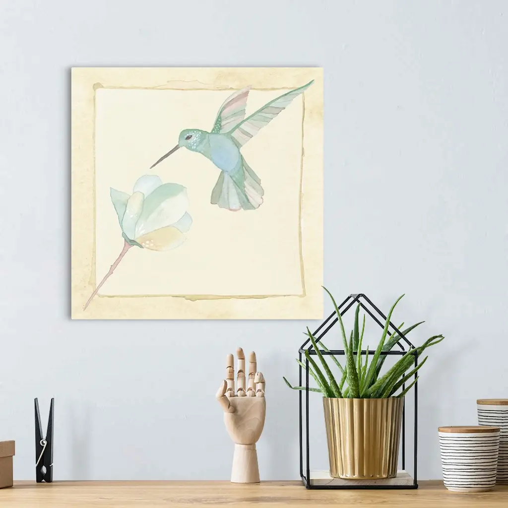 Contemporary watercolor painting of a hummingbird feeding at a flower, in pastel tones.