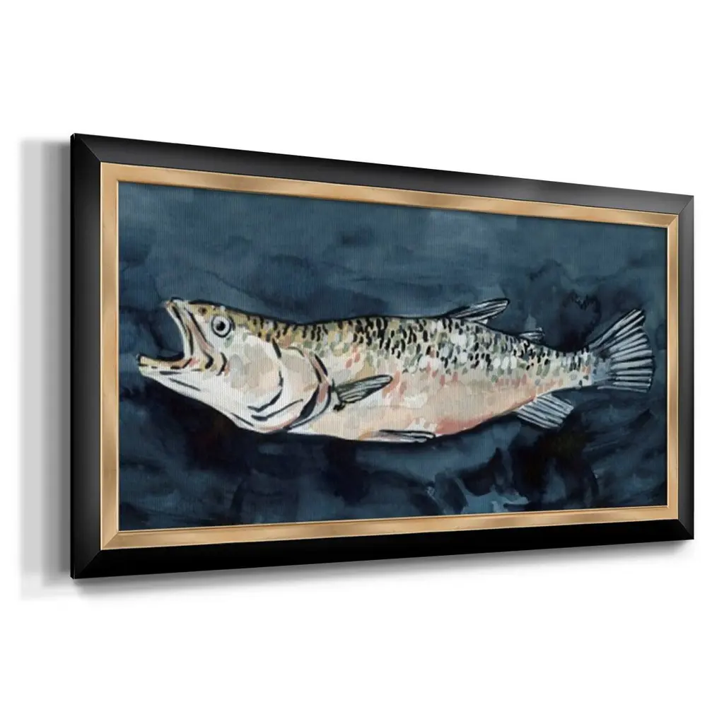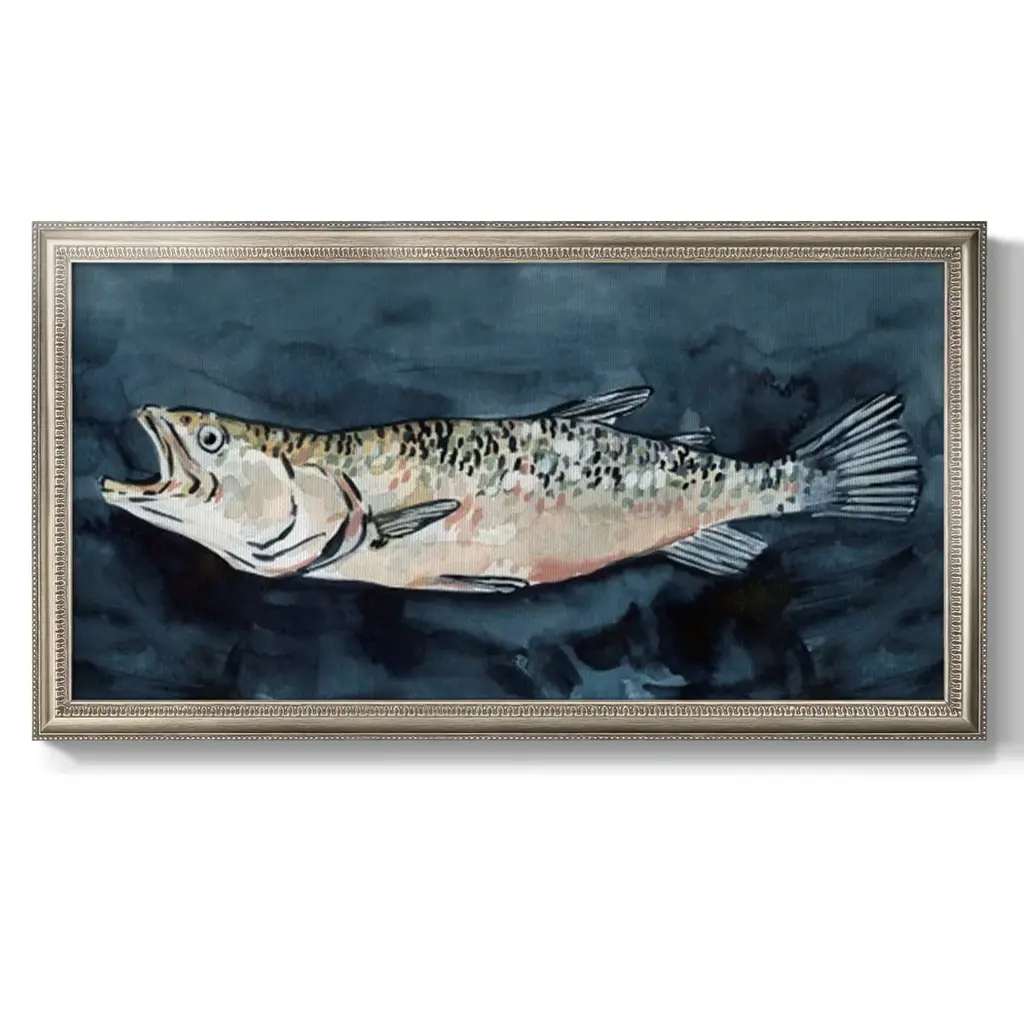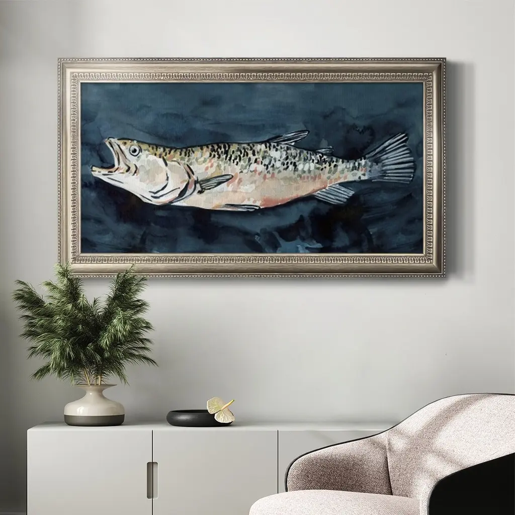 Hungry Fish I Premium Framed Canvas- Ready to Hang A Premium Framed Canvas created to last. Framed in distressed wood and available in an array of sizes and colors Featuring a beveled a solid wood stretcher bar, each piece comes ready to hand 3 SIZES AVAILABLE 21''X37'' - Overall Size 25''X45'' - Overall Size 29''x53'' - Overall Size Each piece is made to order. Each piece comes with hanging hardware. Made in the USA Ready to Hang Giclee Paper Print Acrylic Glass Beveled Matt Board