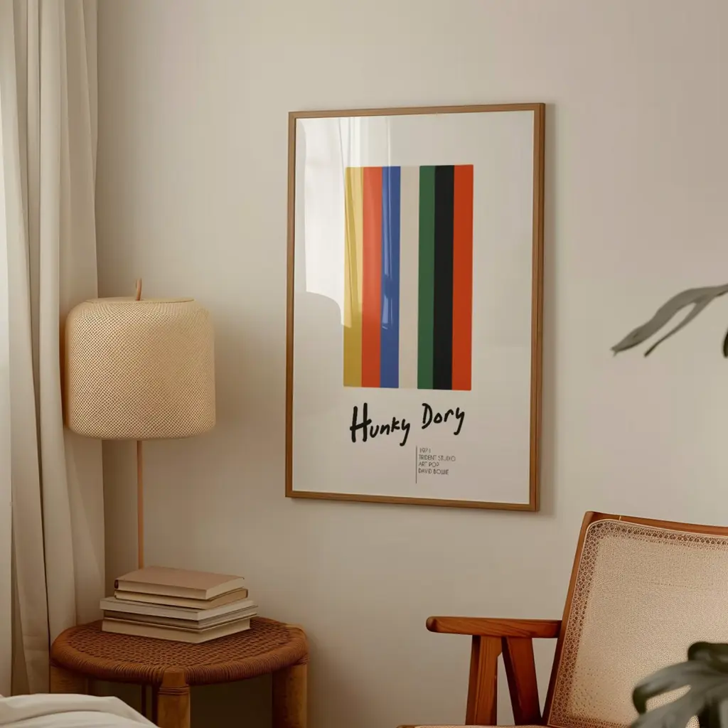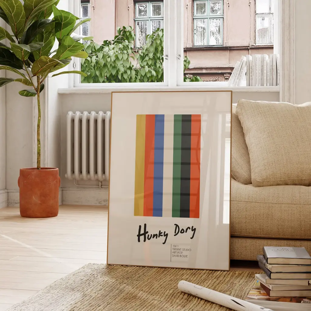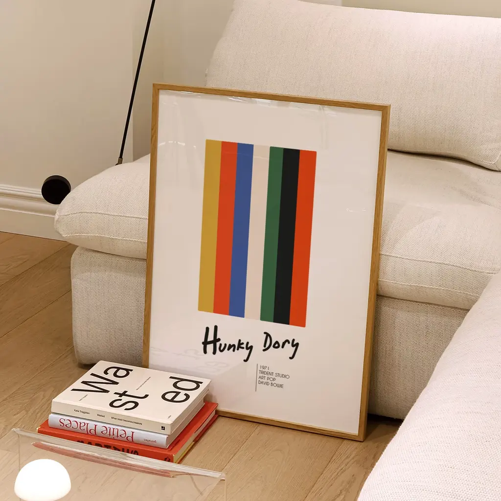 1970s classic striped Hunky Dory Print inspired by the iconic sounds of David Bowie. The perfect mid century inspired wall art, pair with plants and mid century teak.Sold without frameGiclée printed on Munken pure smooth cream paper which is certified by the Rainforest Alliance Program for FSC® Standards.