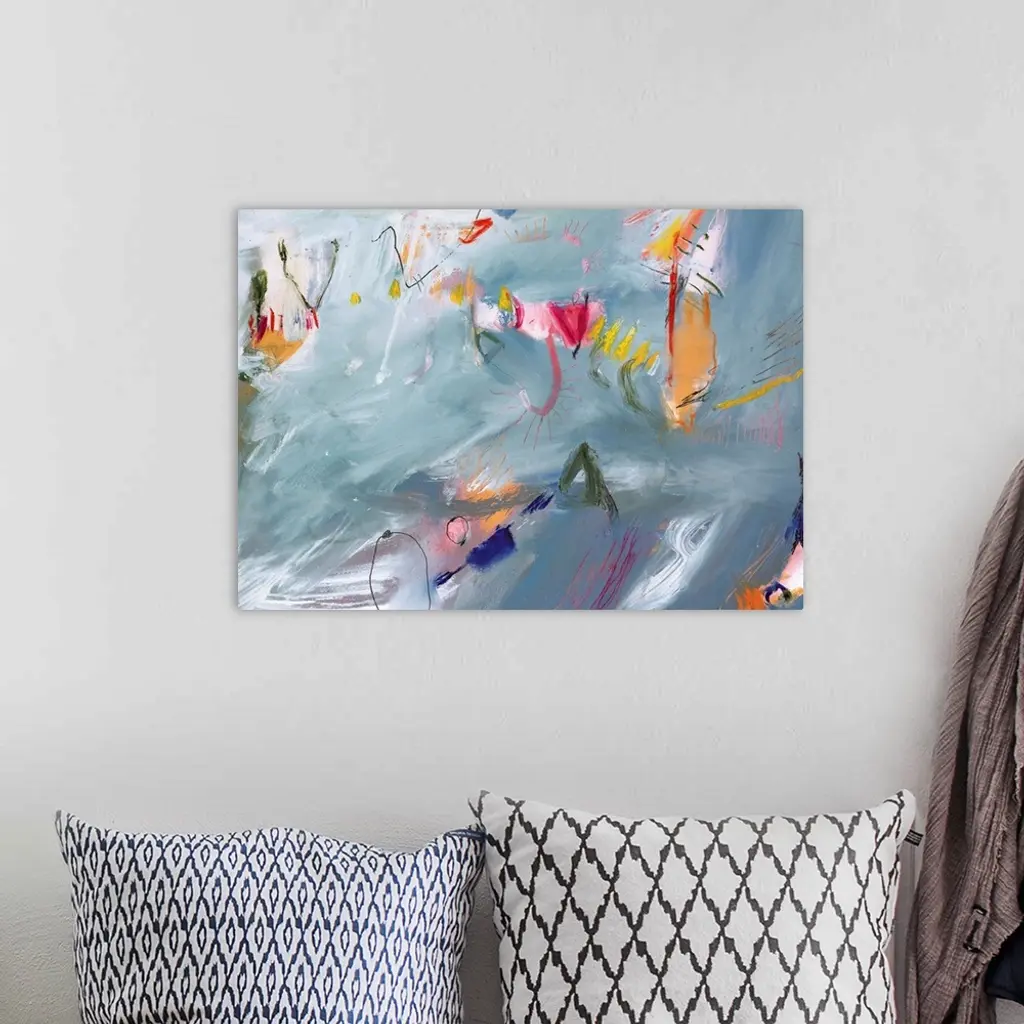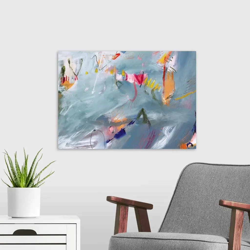 An abstract painting with amoeba like shapes swimming around the streaky paint textures in the background of this decorative wall art.