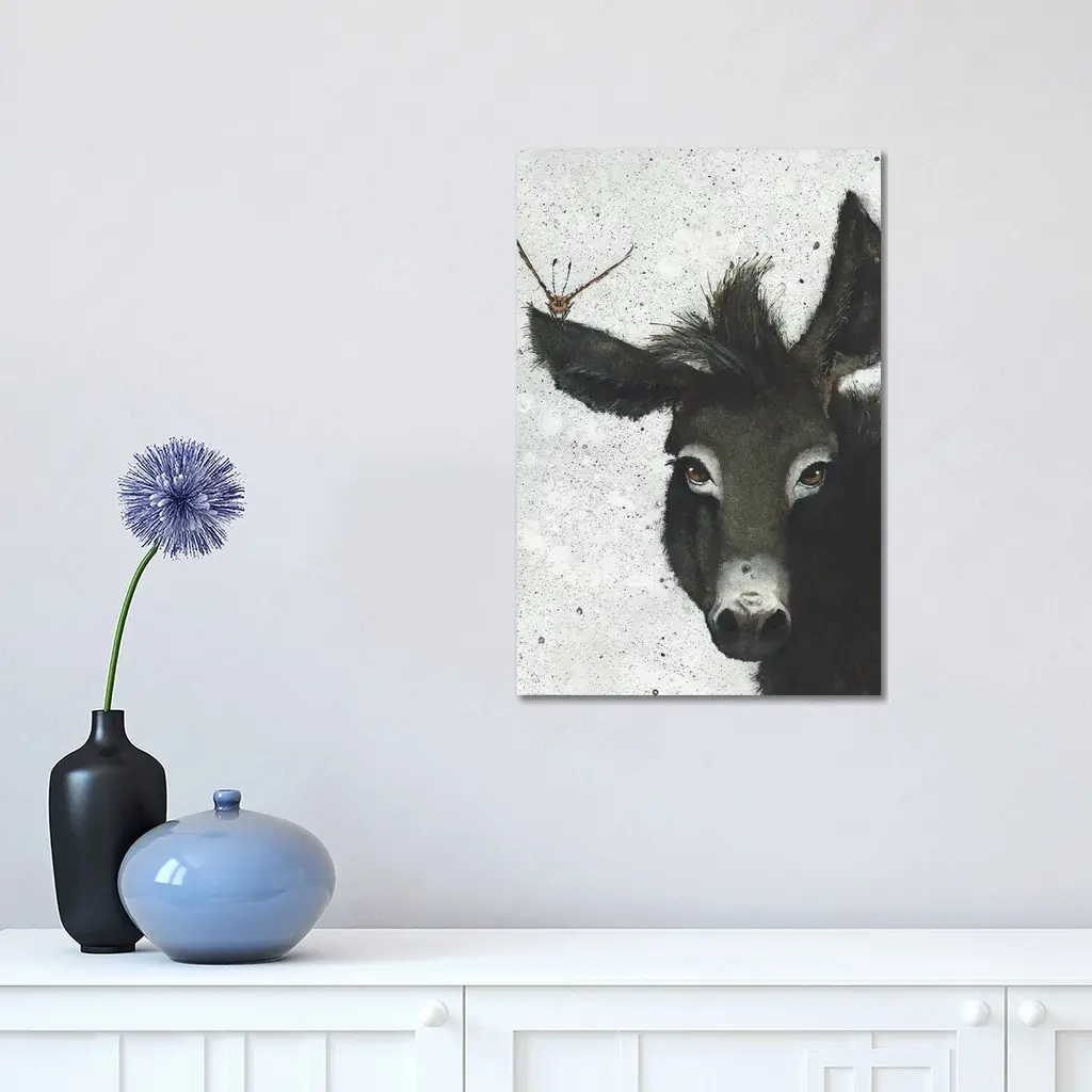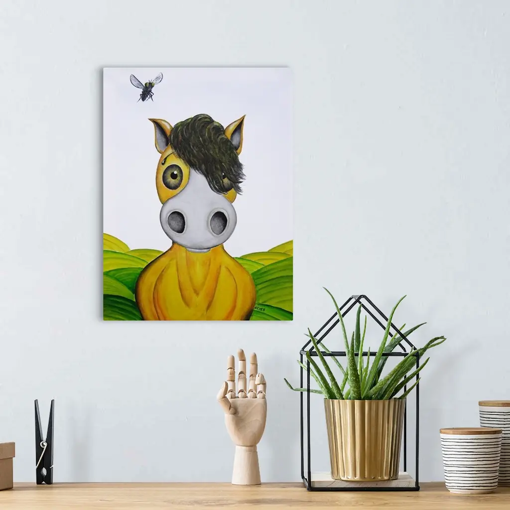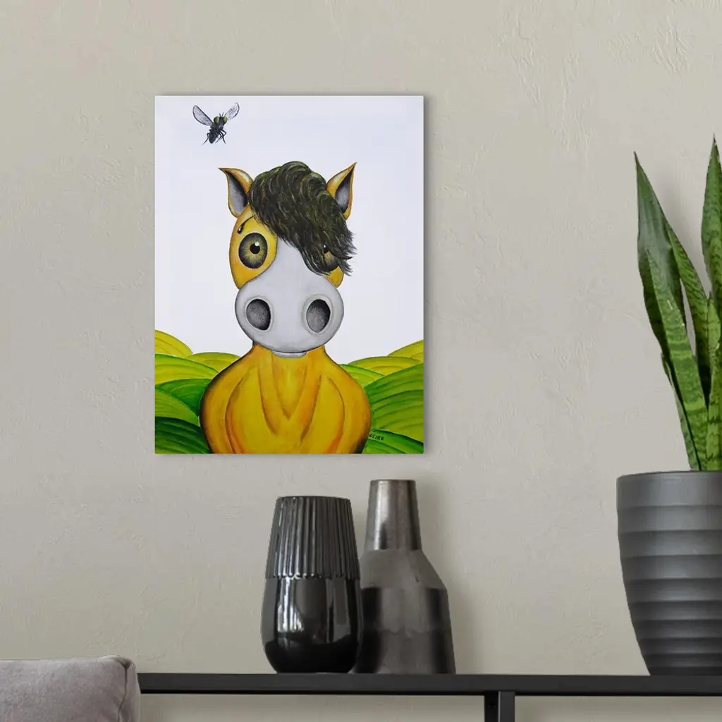 Contemporary painting of a horse with a cartoon-like face and a fly above its ear.