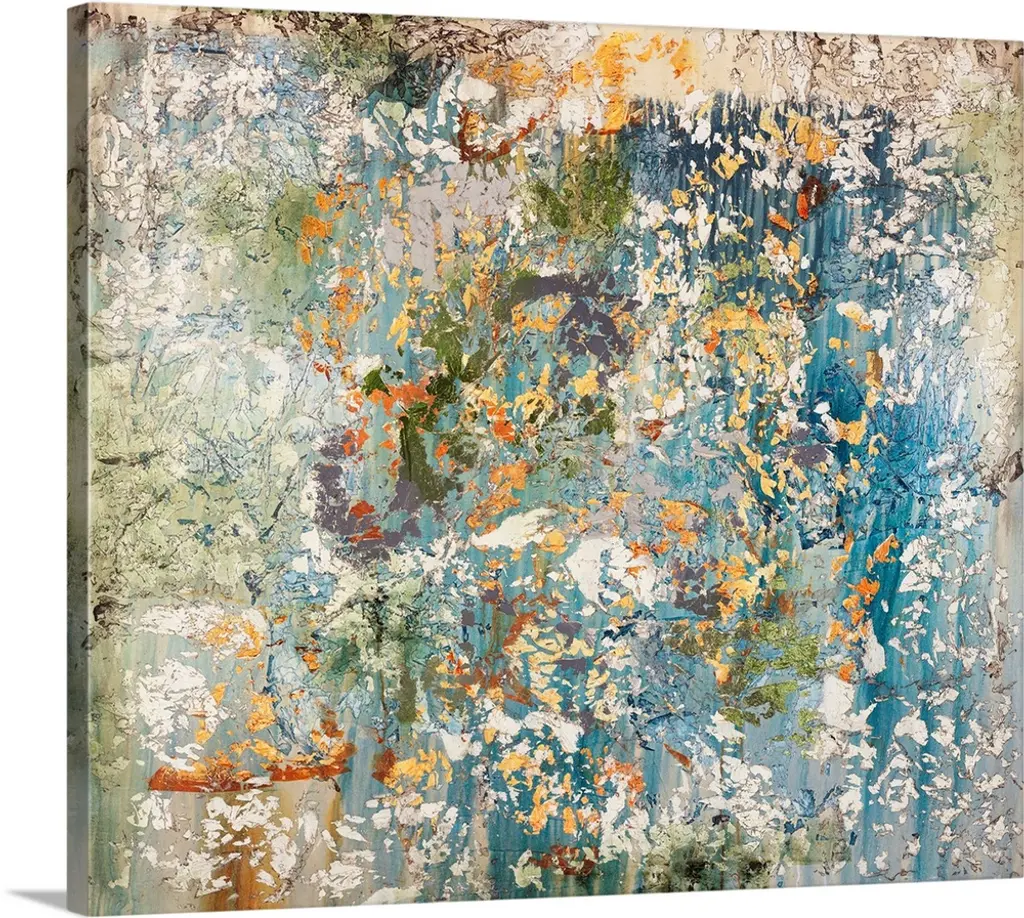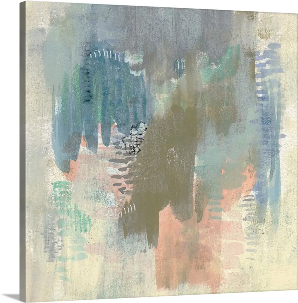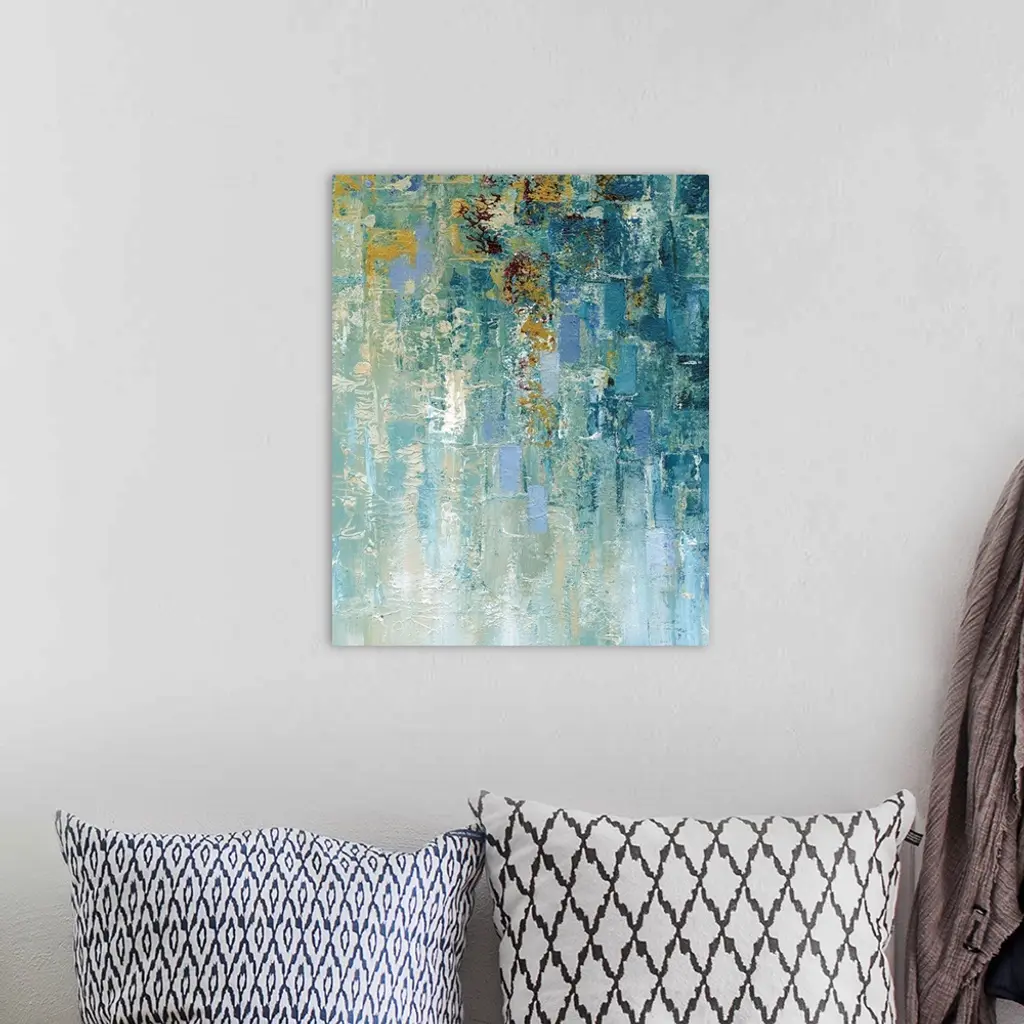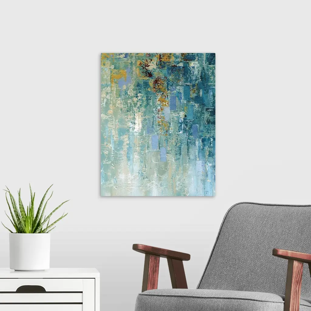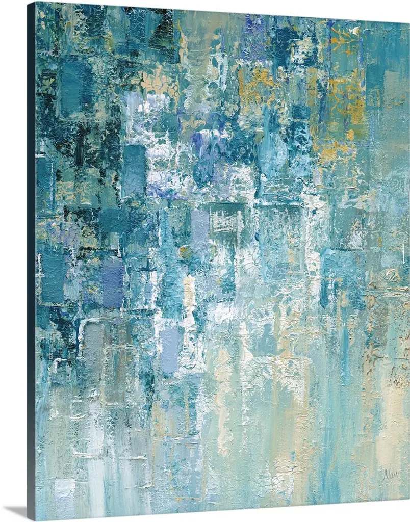Vertical abstract painting comprised of cascading heavy textured painted rectangles in shades of blue, beige, yellow and red.