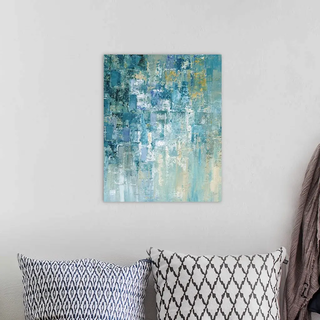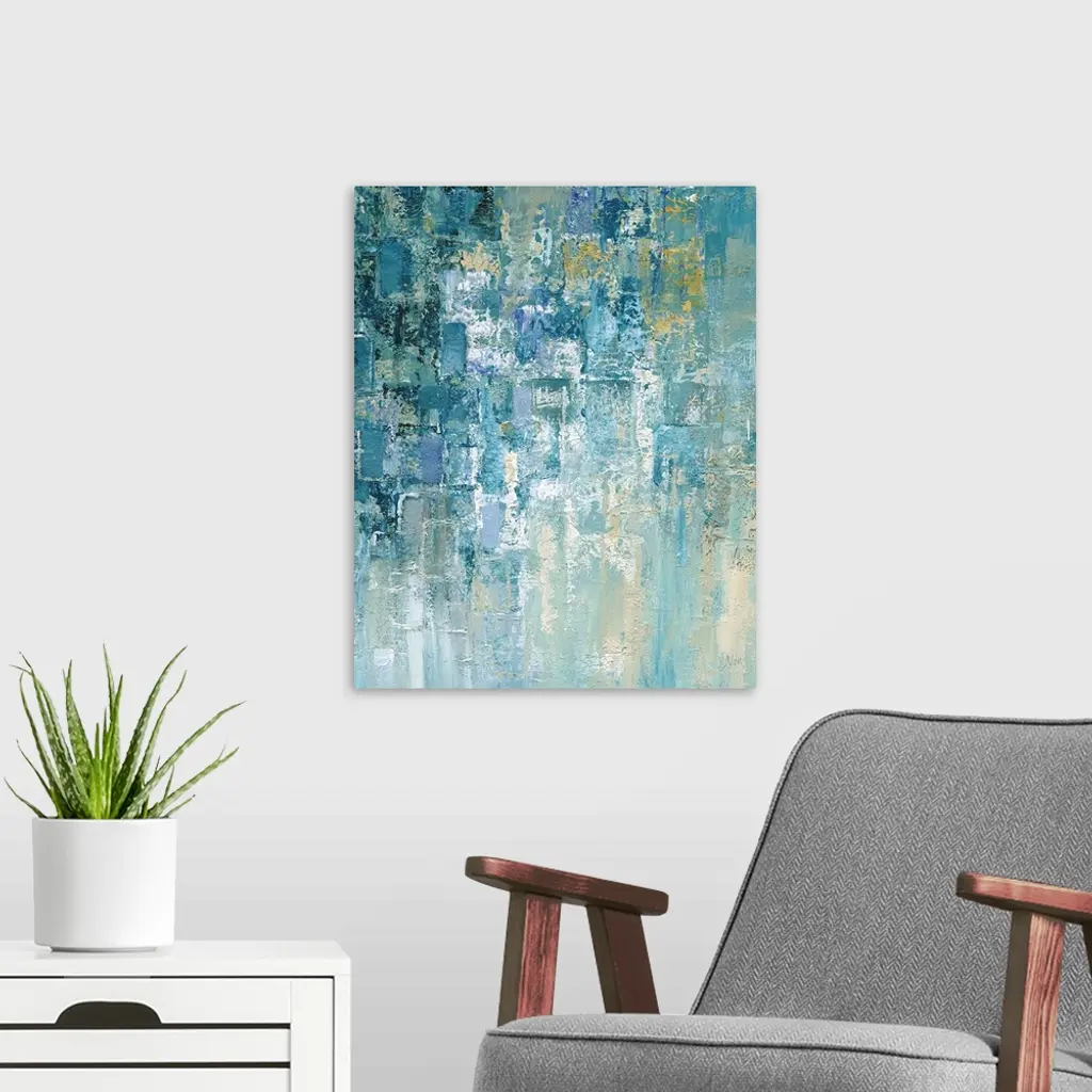 Vertical abstract painting comprised of cascading heavy textured painted rectangles in shades of blue, beige, and yellow.