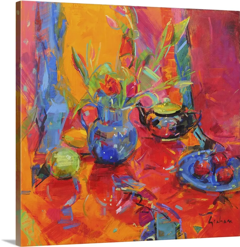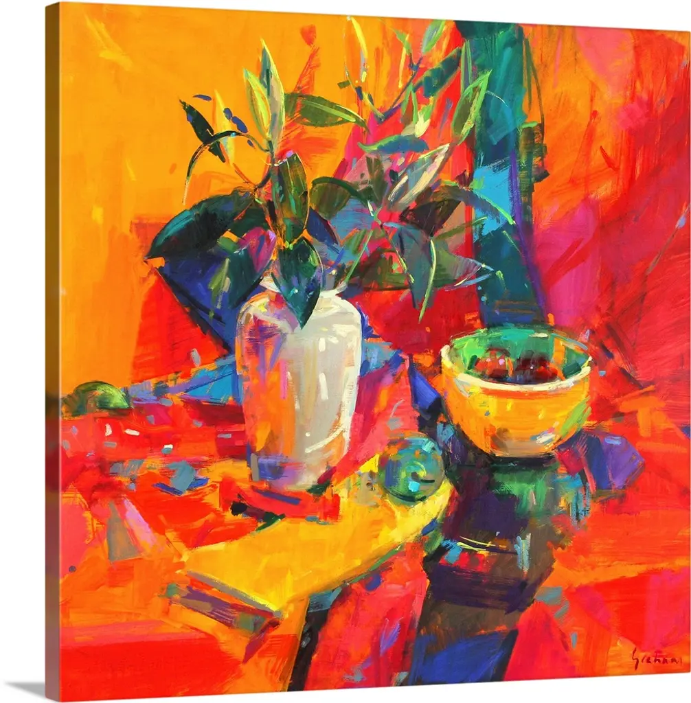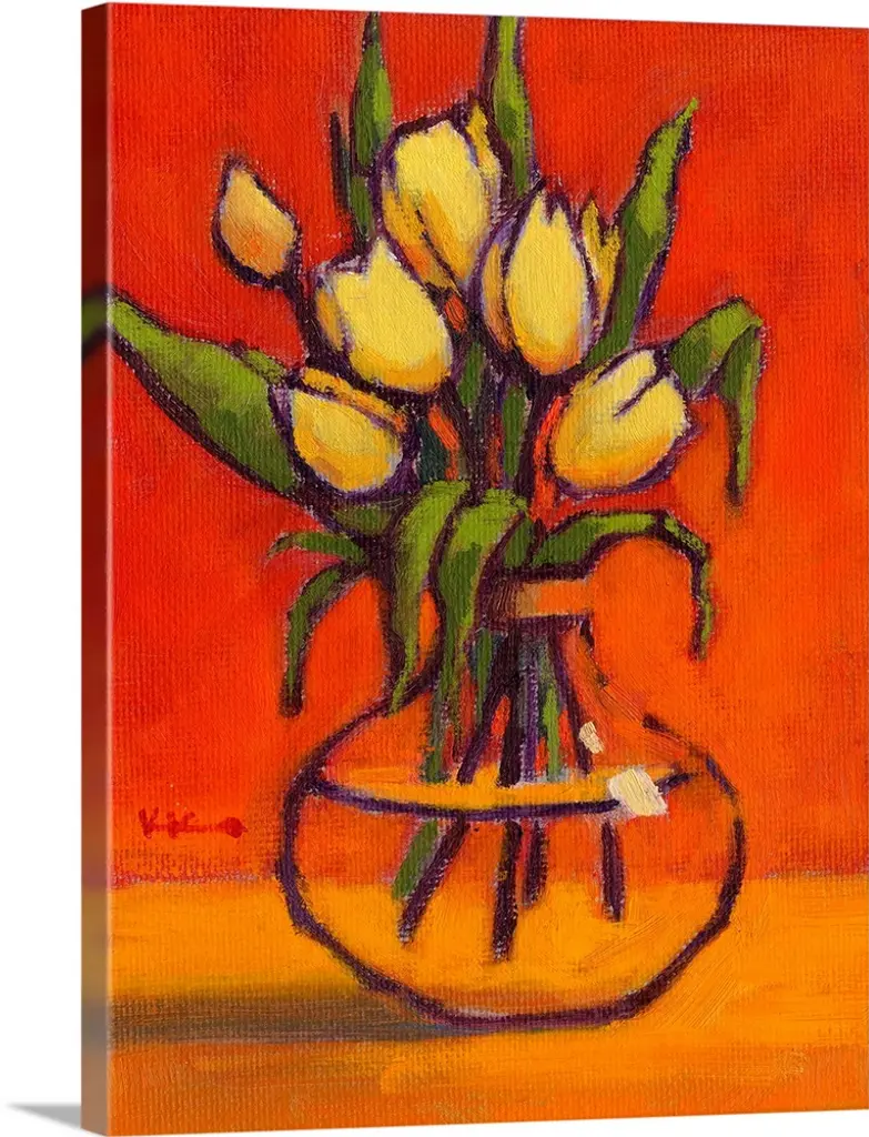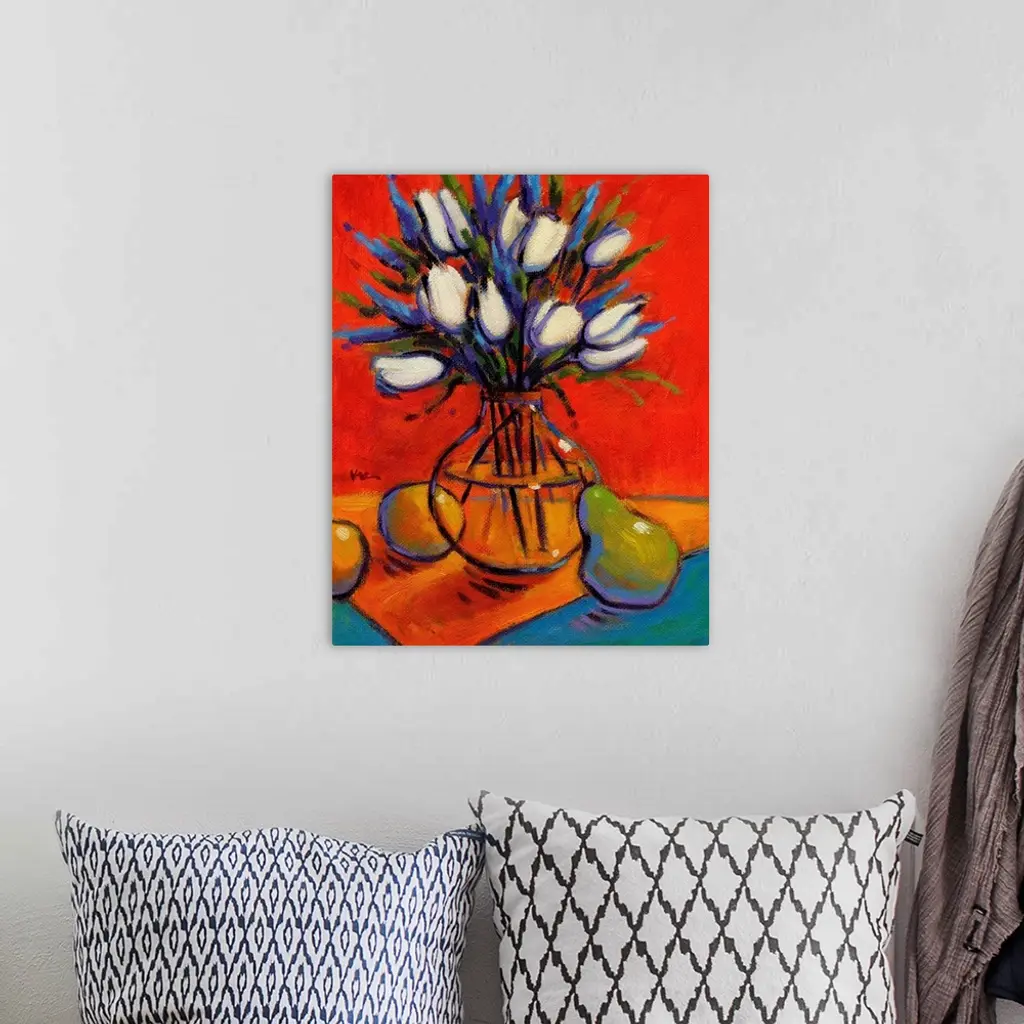 A vertical contemporary painting of a glass vase of eloquent flowers and pears.