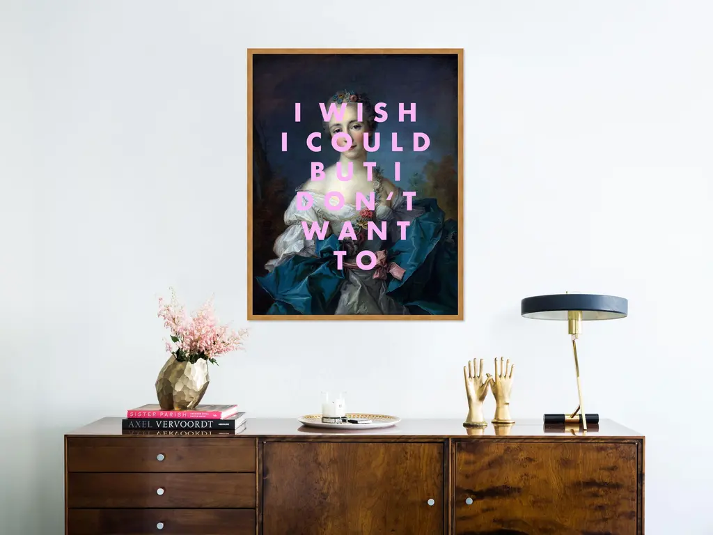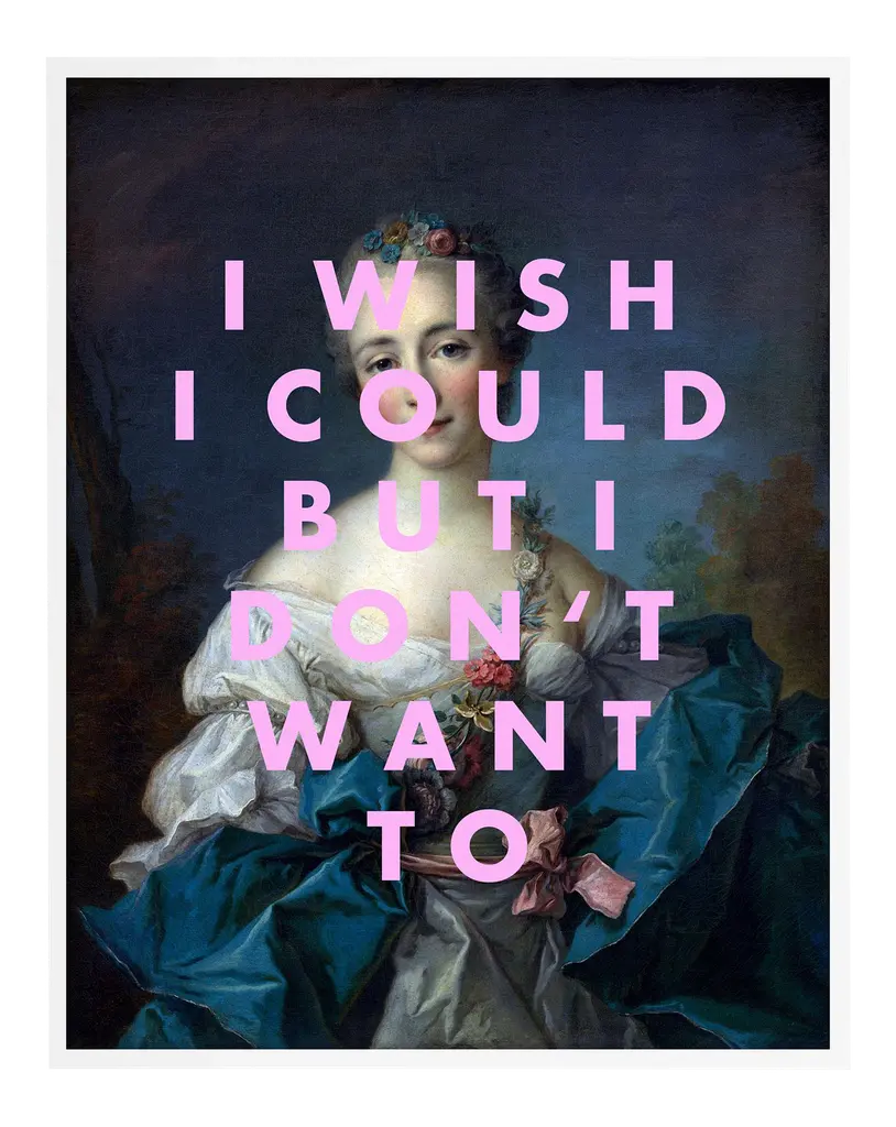 DESCRIPTION: I Wish I Could by Lara Fowler in Gold Framed Paper, Medium Art Print SPECIFICATIONS: Type: Framed Paper. Framed Size (in): 28.5x36. Orientation: Vertical. Flush/Float/Matted: Flush. Frame Color: Gold. Hanging Hardware: Picture Perfect. FRAMING: Each art work arrives framed and ready to hang. We use handmade frames with a plexiglass glazing front, because it offers less glare than standard glass. At this time, we only offer framed prints. ARTIST BIO: Lara Fowler is a British artist who creates quirky art prints with a twist.