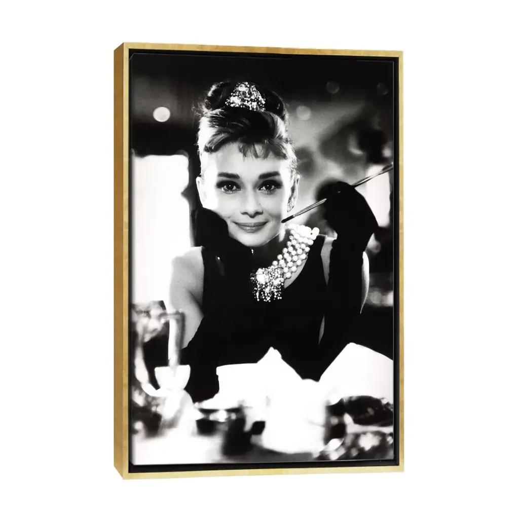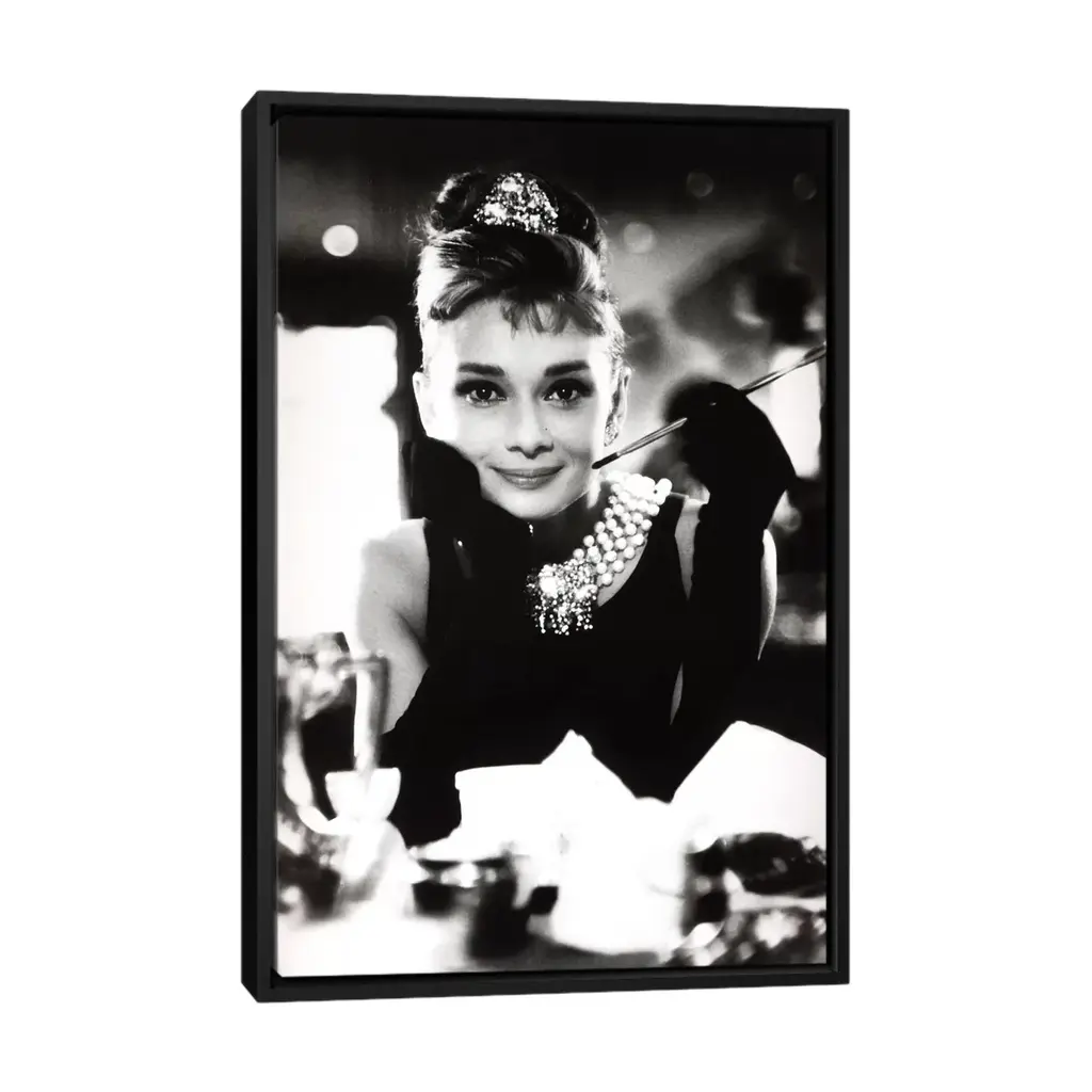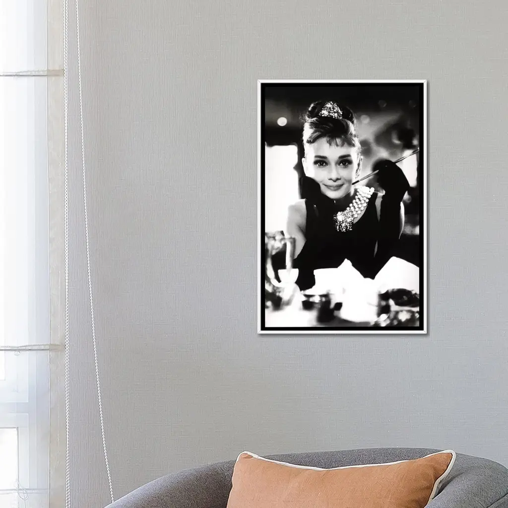 Icanvas "A Smiling Audrey Hepburn" By Radio Days Framed Canvas Print - White - 40x26