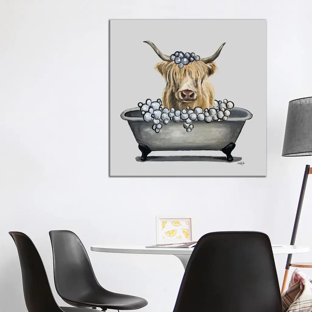 Icanvas "Animals In The Tub Series, Highland Cow In Bathtub" By Hippie Hound Studios Canvas Print - 26x26x1.5