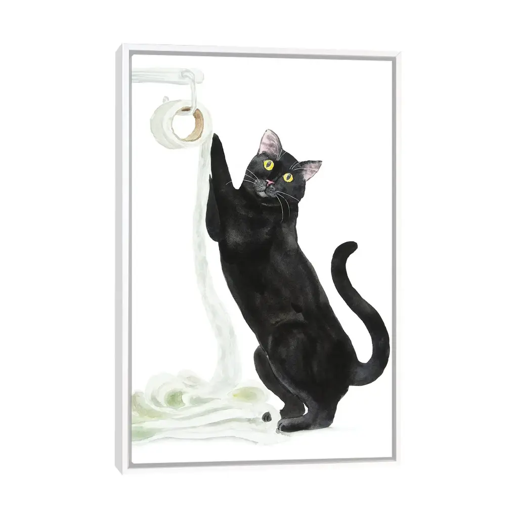 Icanvas "Black Cat And Toilet Paper" By Alexey Dmitrievich Shmyrov Framed Canvas Print - White - 26x18