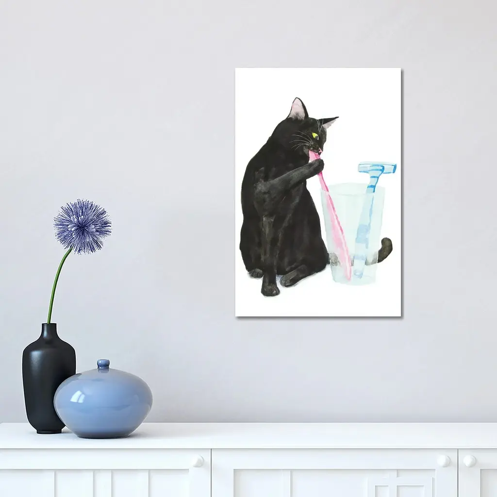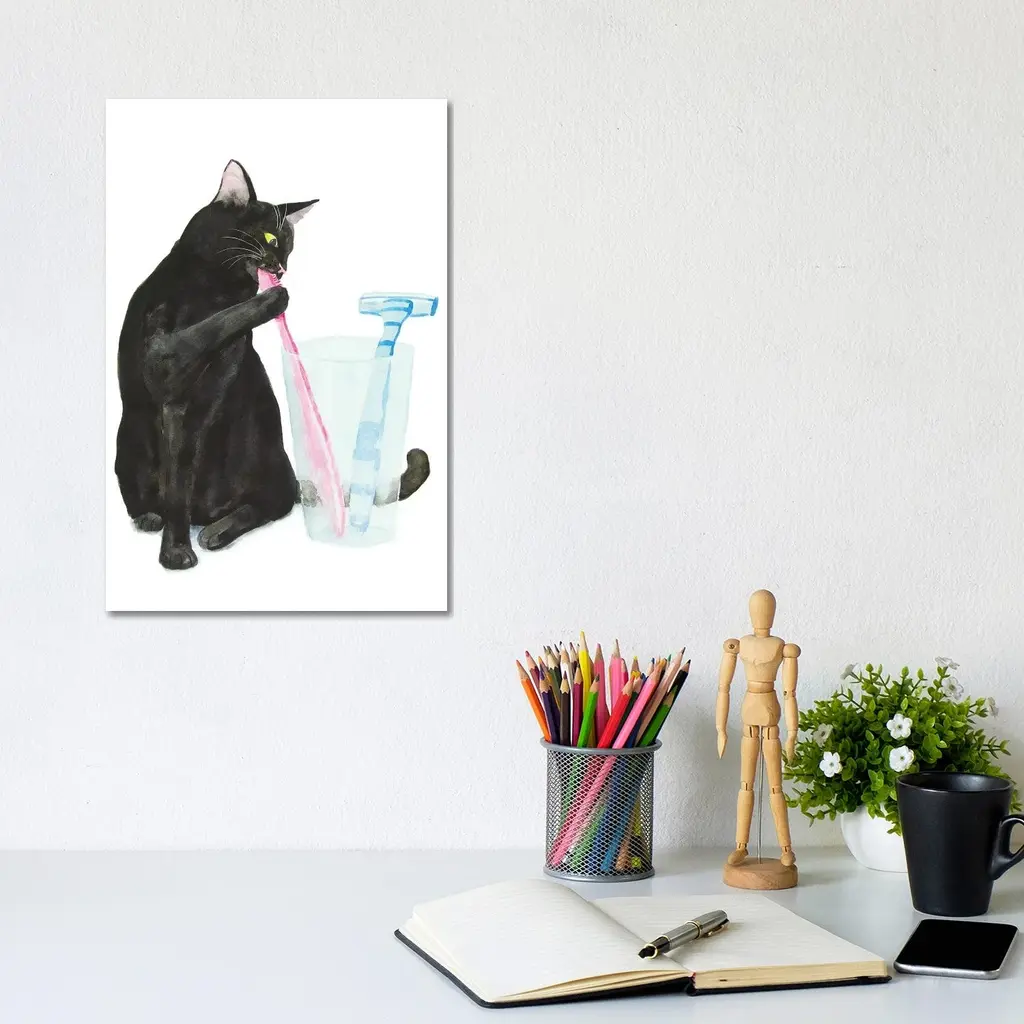 Icanvas "Black Cat Brushing Teeth" By Alexey Dmitrievich Shmyrov Canvas Print - 40x26x1.5