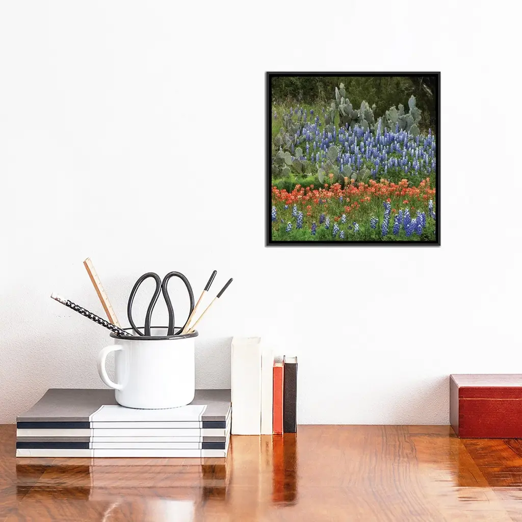 Icanvas "Bluebonnet, Paintbrush Cactus, Texas And Pricky Pear - Horizontal" By Tim Fitzharris Framed Canvas Print - Gold - 12x12