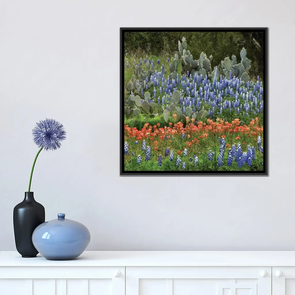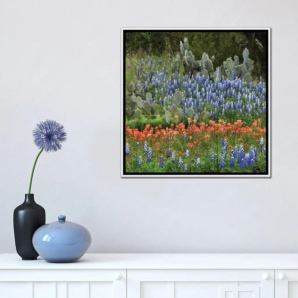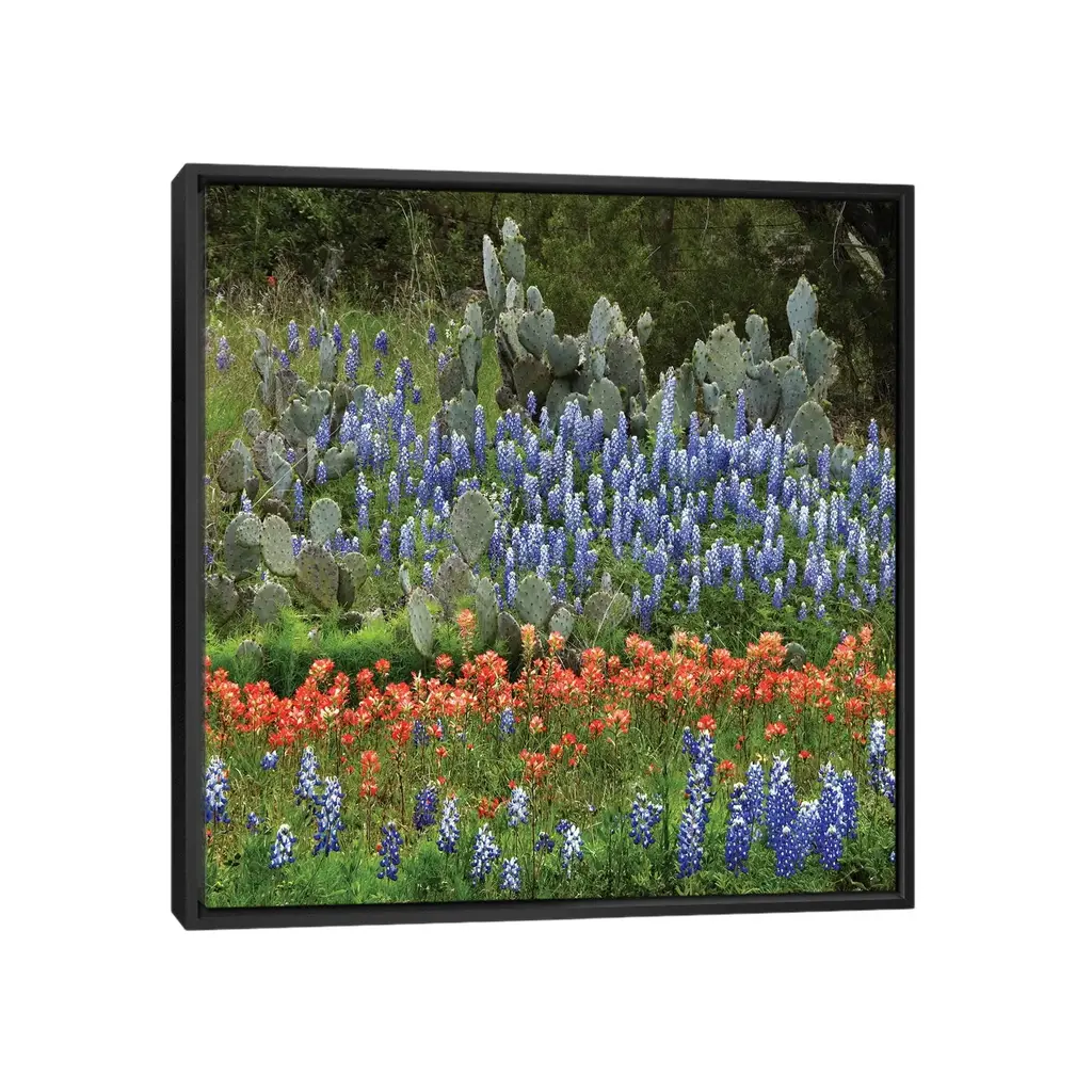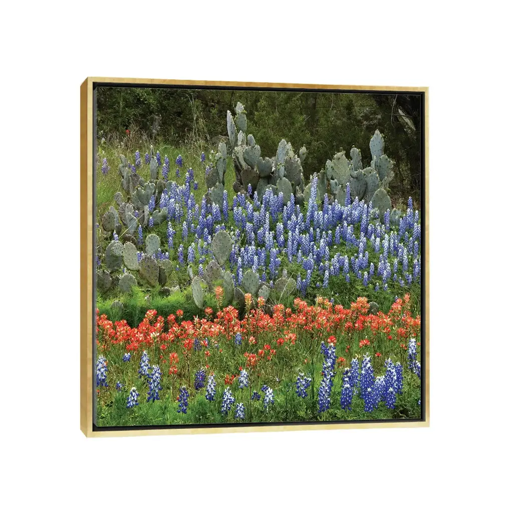 Icanvas "Bluebonnet, Paintbrush Cactus, Texas And Pricky Pear - Horizontal" By Tim Fitzharris Framed Canvas Print - Gold - 18x18