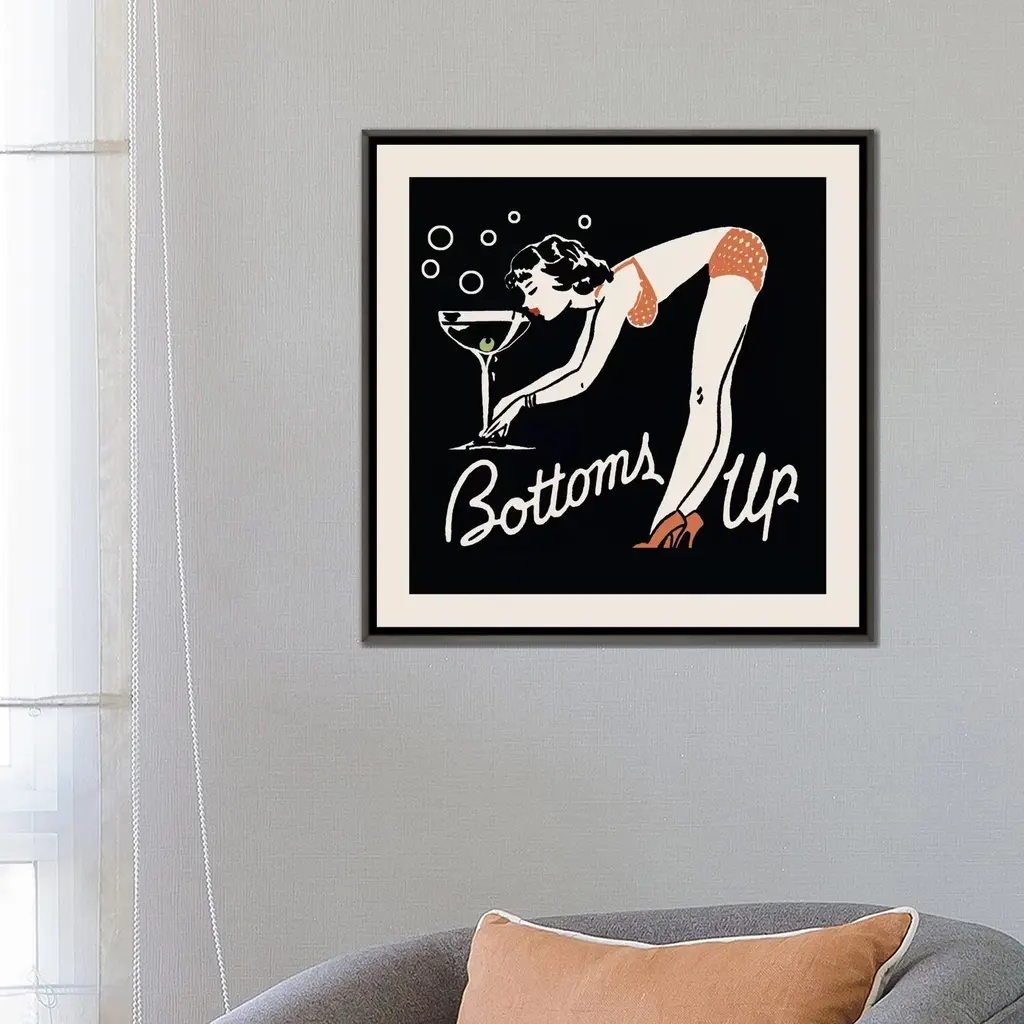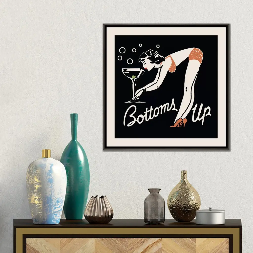 Icanvas "Bottoms Up - Vintage Ad Poster" By Retro Series Framed - 26x26 - Charcoal