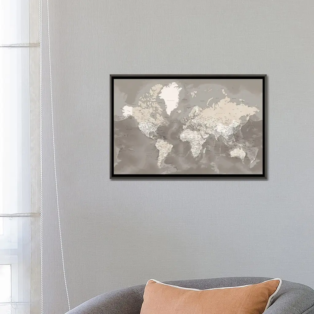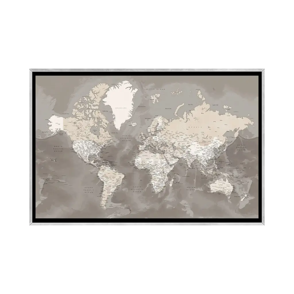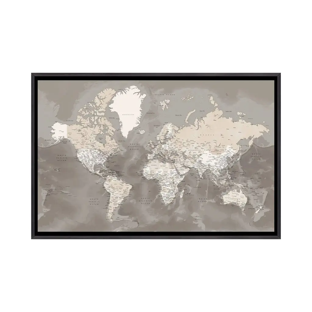 Icanvas "Brown Detailed World Map With Cities, Davey" By Blursbyai Framed - Charcoal - 18x26