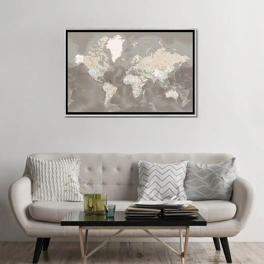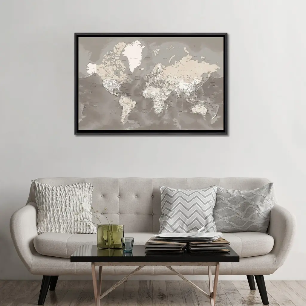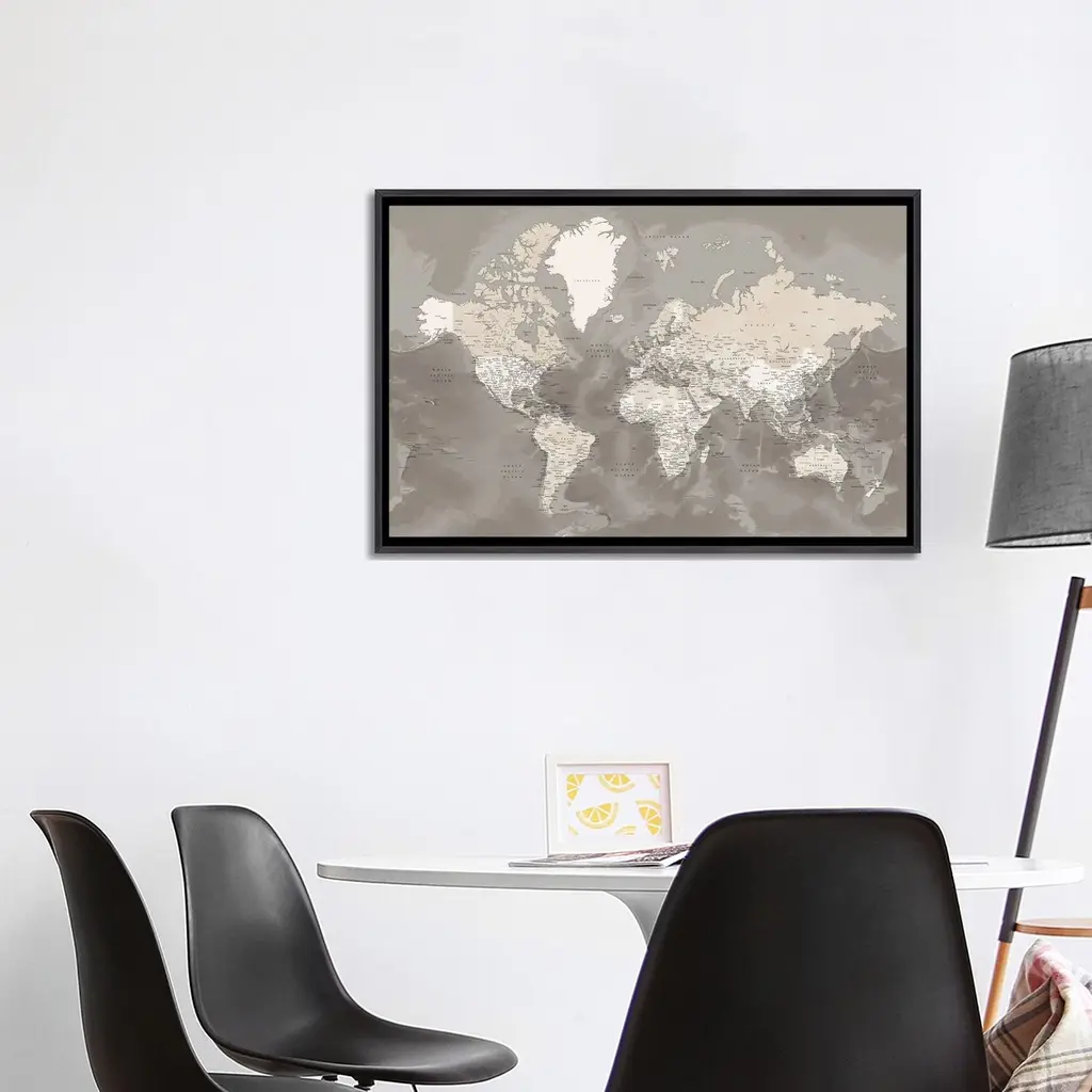 Icanvas "Brown Detailed World Map With Cities, Davey" By Blursbyai Framed - Charcoal - 18x26
