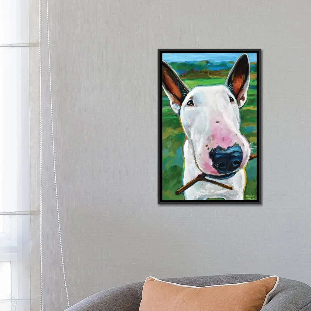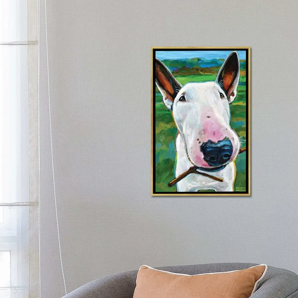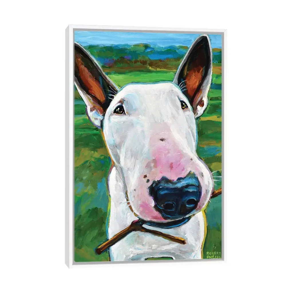 Icanvas "Bull Terrier With Stick" By Robert Phelps Framed Canvas Print - White - 40x26