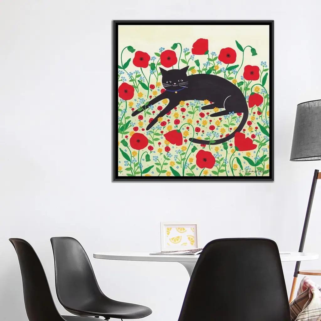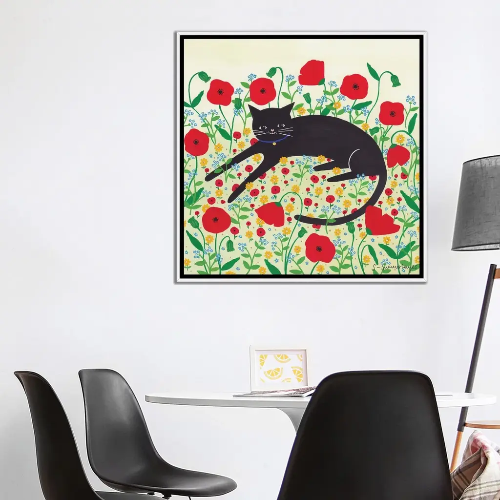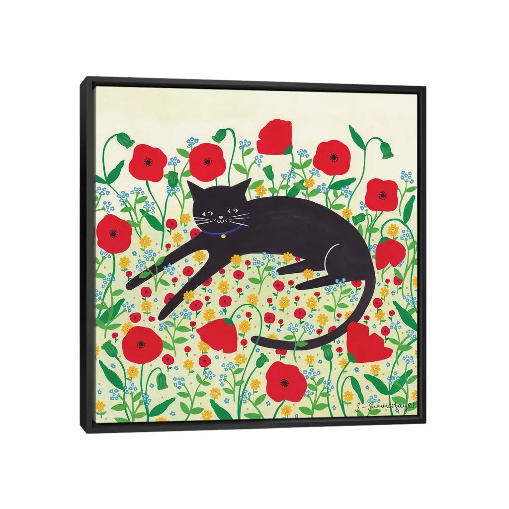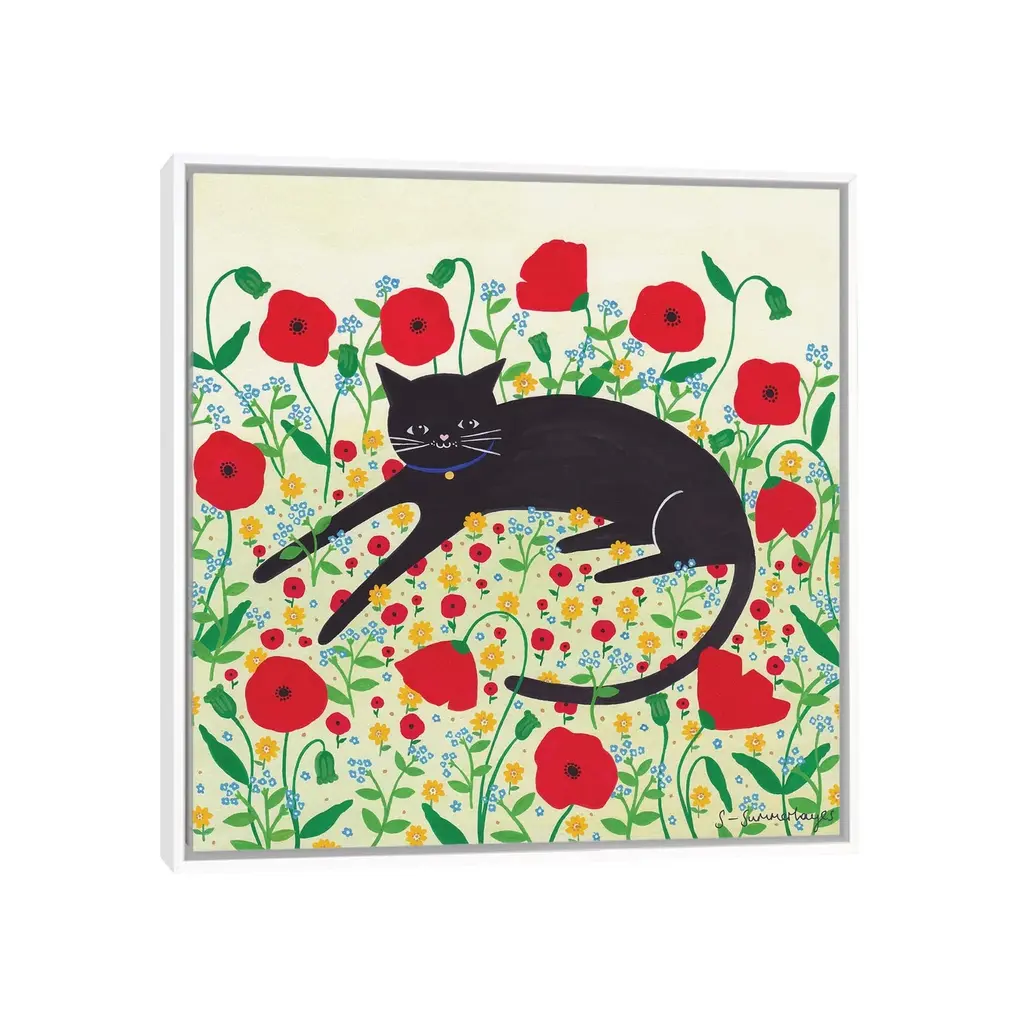 Icanvas "Cat With Poppies" By Sian Summerhayes Framed - White - 12x12