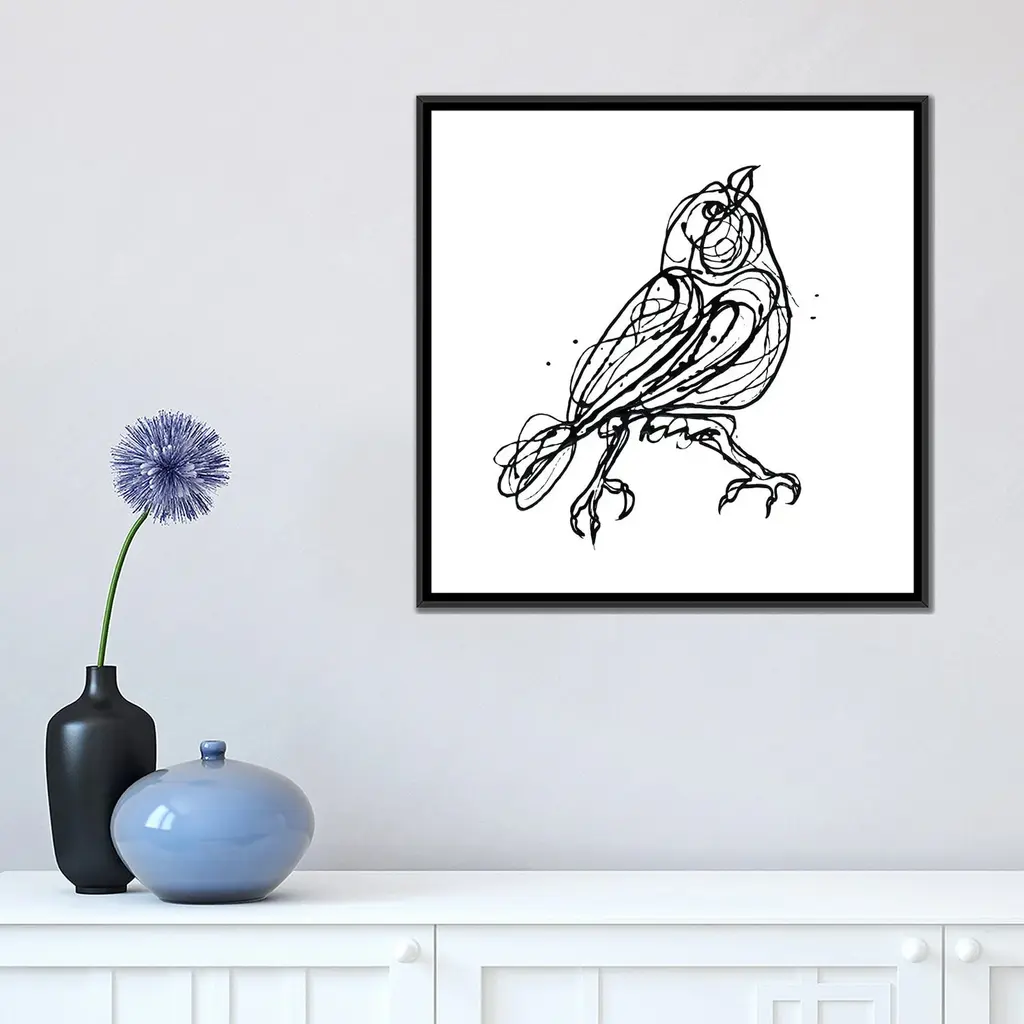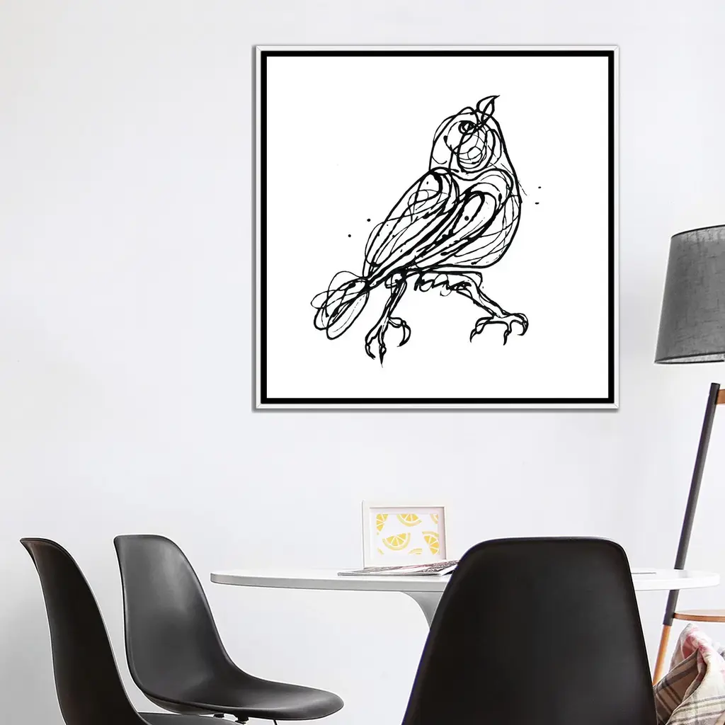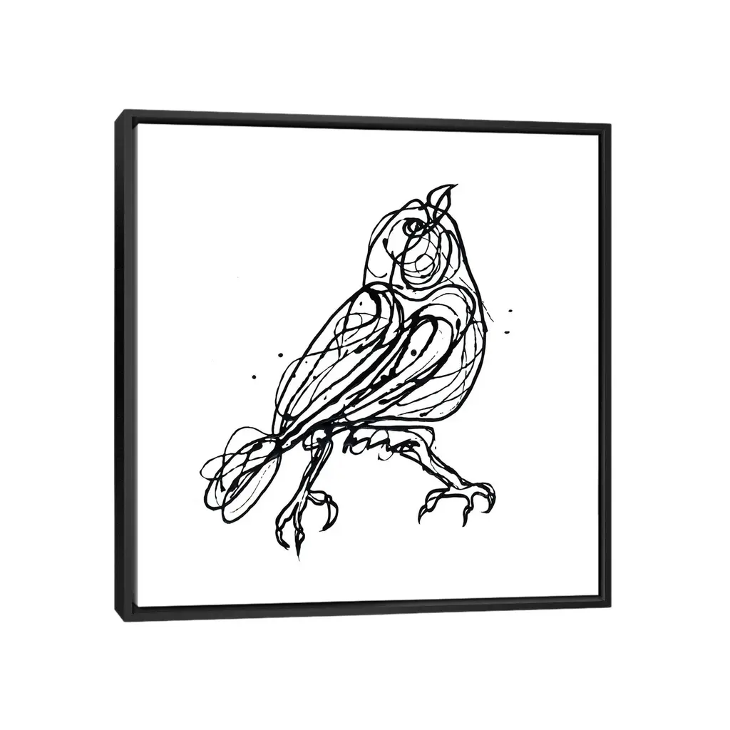 Icanvas "Chin Up - Cute Little Bird Jackson Pollock Style Drawing" By Olena Art Framed - White - 18x18