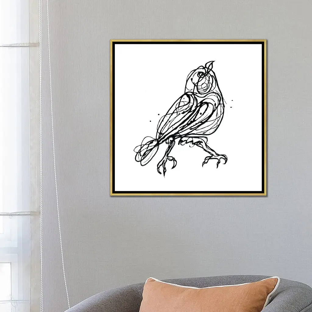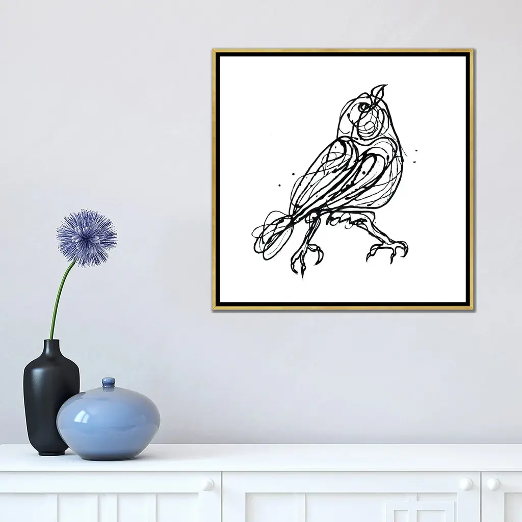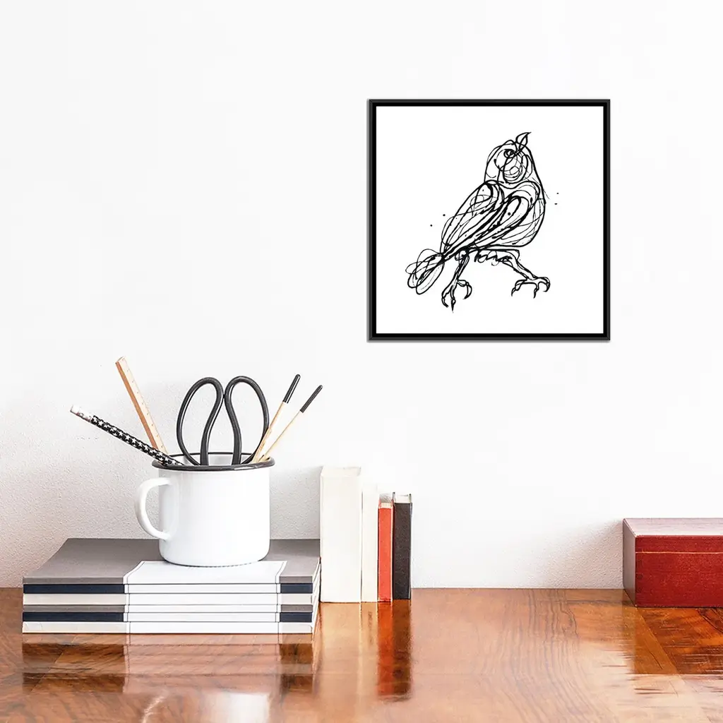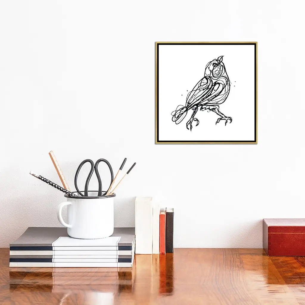 Icanvas "Chin Up - Cute Little Bird Jackson Pollock Style Drawing" By Olena Art Framed - White - 18x18