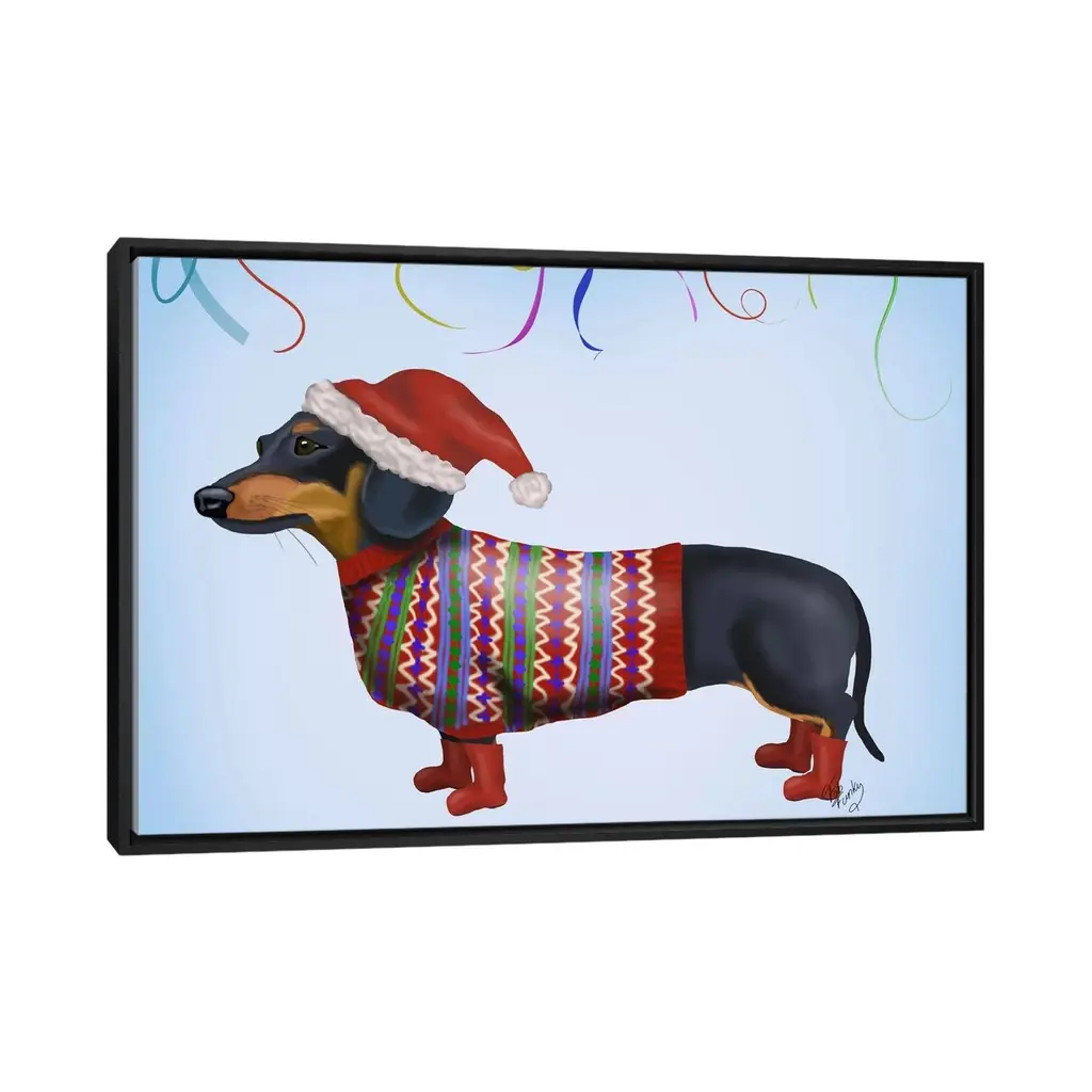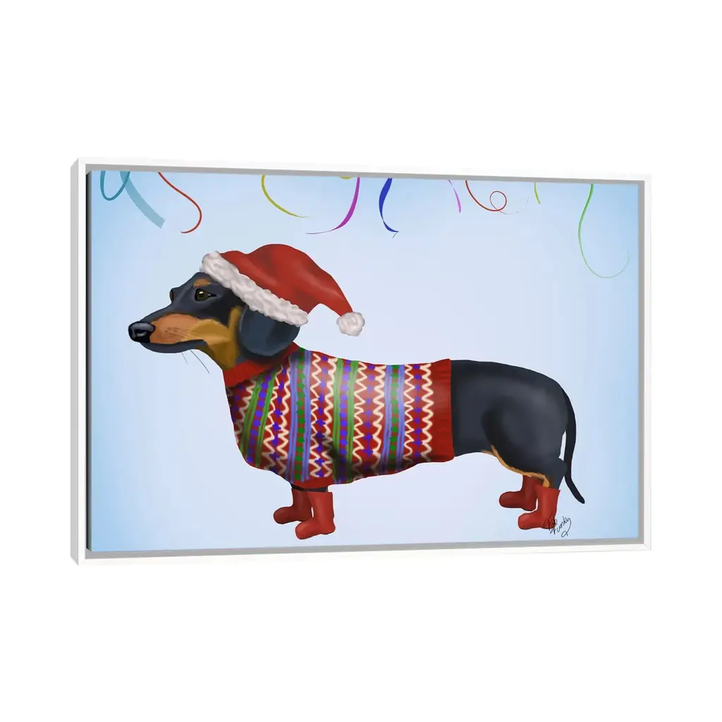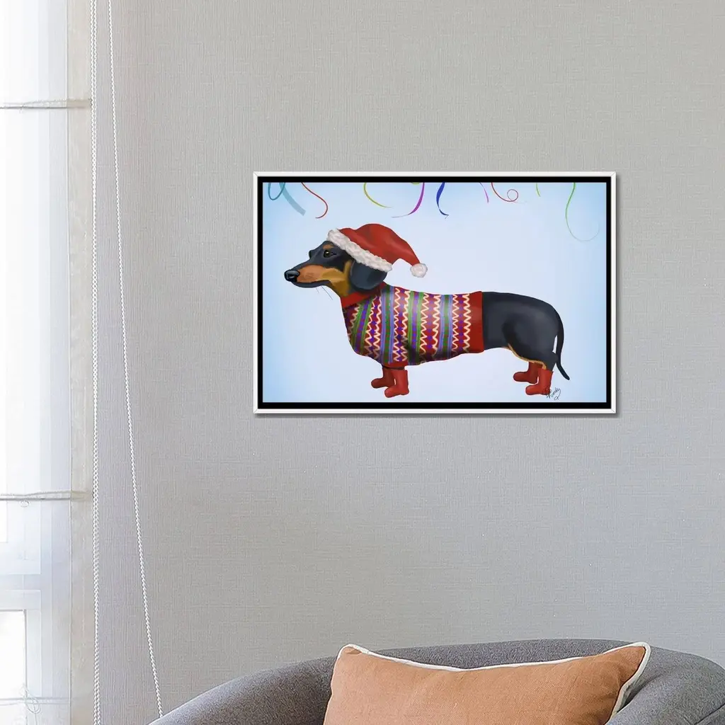 Add a touch of holiday cheer to your space with the iCanvas "Christmas Dachshund" by Fab Funky Framed artwork. This high-quality Giclee canvas artwork is crafted in the USA using artist-grade canvas, giving it the texture and look of a fine-art painting. The artwork is professionally hand-stretched and stapled over North American pine-wood bars in a Gallery Wrap style, commonly used by artists to display their work in galleries. Mounted to a 2 inch thick elegant hardwood frame, the art is inset, creating a "floating" illusion with a 3/8" space between the art and frame. The fade-resistant archival inks ensure vibrant colors that will remain perfect for decades, even when exposed to strong light. Bring contemporary style and exceptional detail to your space with this stunning Christmas-themed artwork.Features: