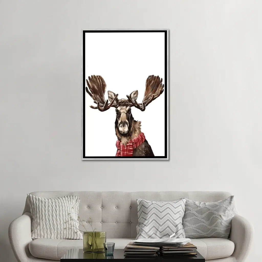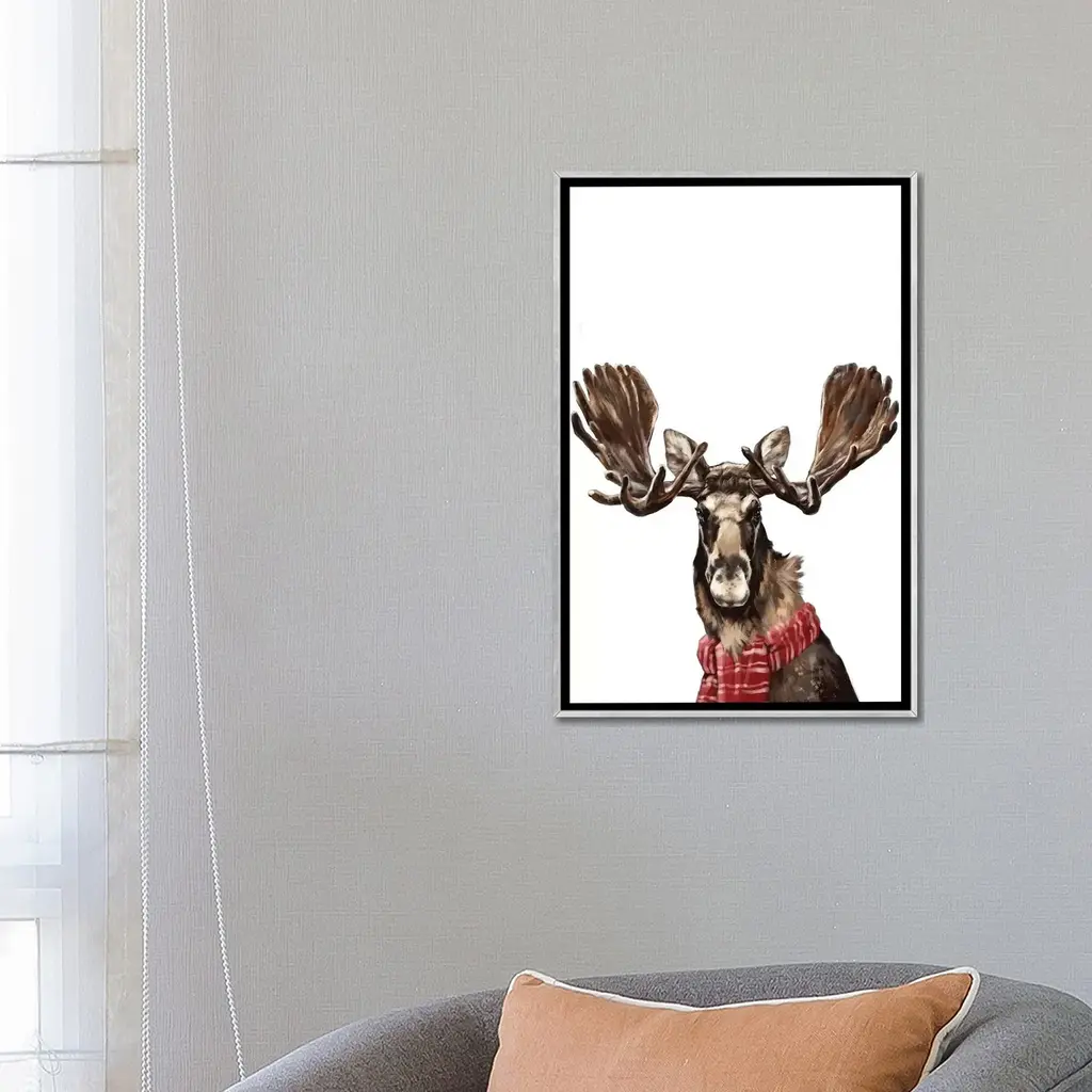 Add a touch of holiday cheer to your space with the iCanvas "Christmas Moose" by Big Nose Work Framed. This high-quality artwork is printed on artist-grade canvas, giving it the texture and look of a fine-art painting. The canvas is professionally hand-stretched and stapled over North American pine-wood bars in a Gallery Wrap style, just like art displayed in galleries. It comes mounted to a 2-inch thick, elegant hardwood frame, creating a "floating" illusion with a 3/8" space between the art and frame. The fade-resistant archival inks ensure vibrant color reproduction that will last for decades. Elevate your space with this contemporary and detailed holiday artwork.Features: