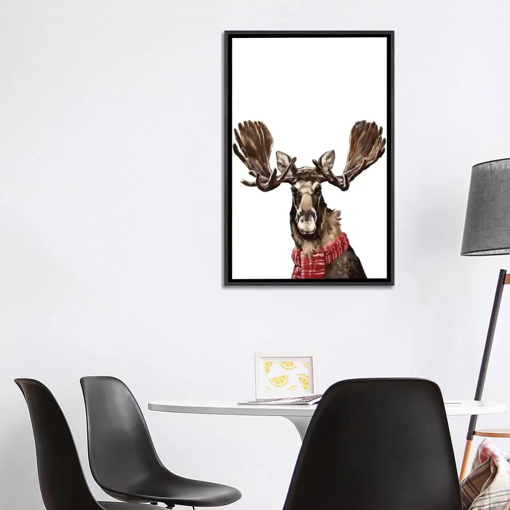 Add a touch of holiday cheer to your space with the iCanvas "Christmas Moose" by Big Nose Work Framed. This high-quality artwork is printed on artist-grade canvas, giving it the texture and look of a fine-art painting. The canvas is professionally hand-stretched and stapled over North American pine-wood bars in a Gallery Wrap style, just like art displayed in galleries. It comes mounted to a 2-inch thick, elegant hardwood frame, creating a "floating" illusion with a 3/8" space between the art and frame. The fade-resistant archival inks ensure vibrant color reproduction that will last for decades. Elevate your space with this contemporary and detailed holiday artwork.Features: