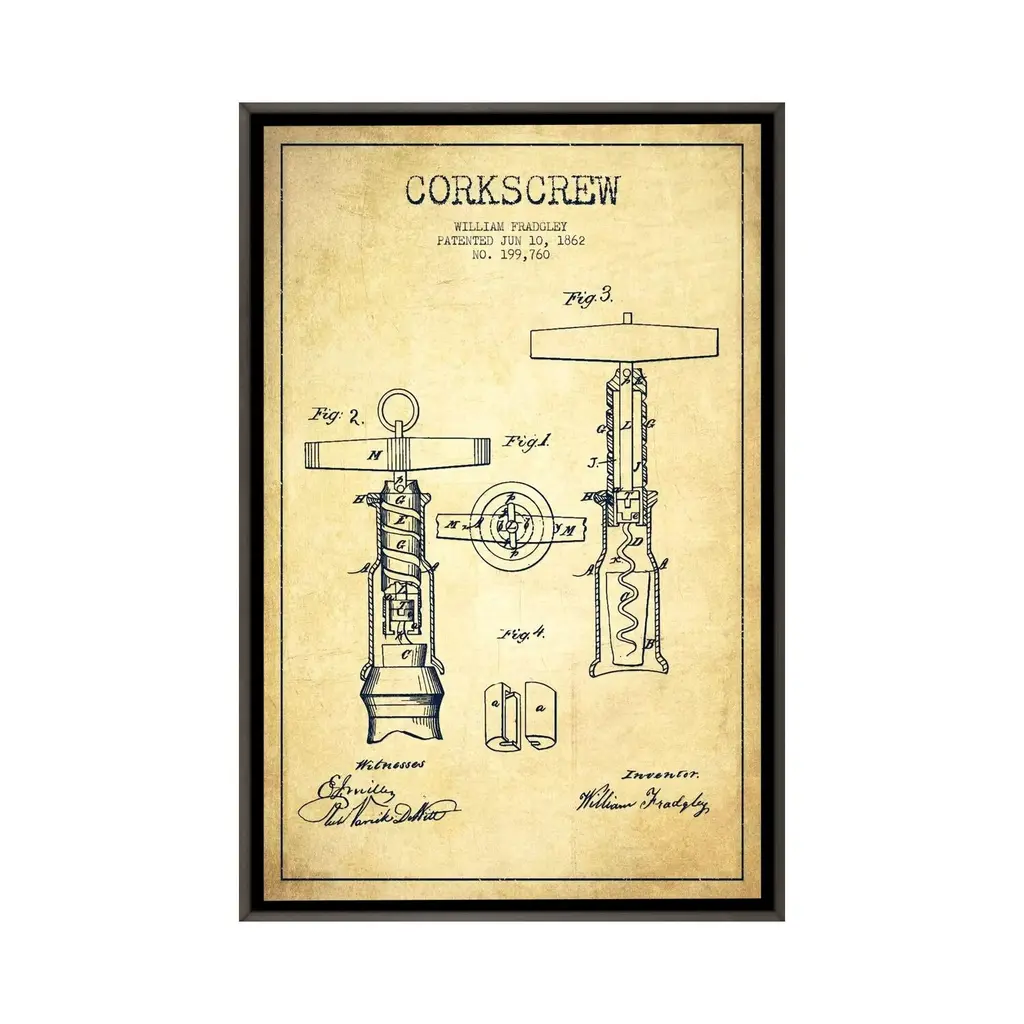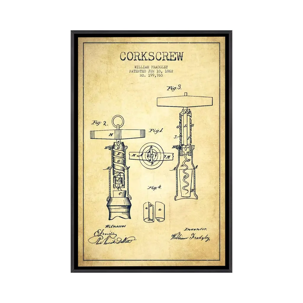 Icanvas "Corkscrew Vintage Patent Blueprint" By Aged Pixel Framed - Ebony - 40x26