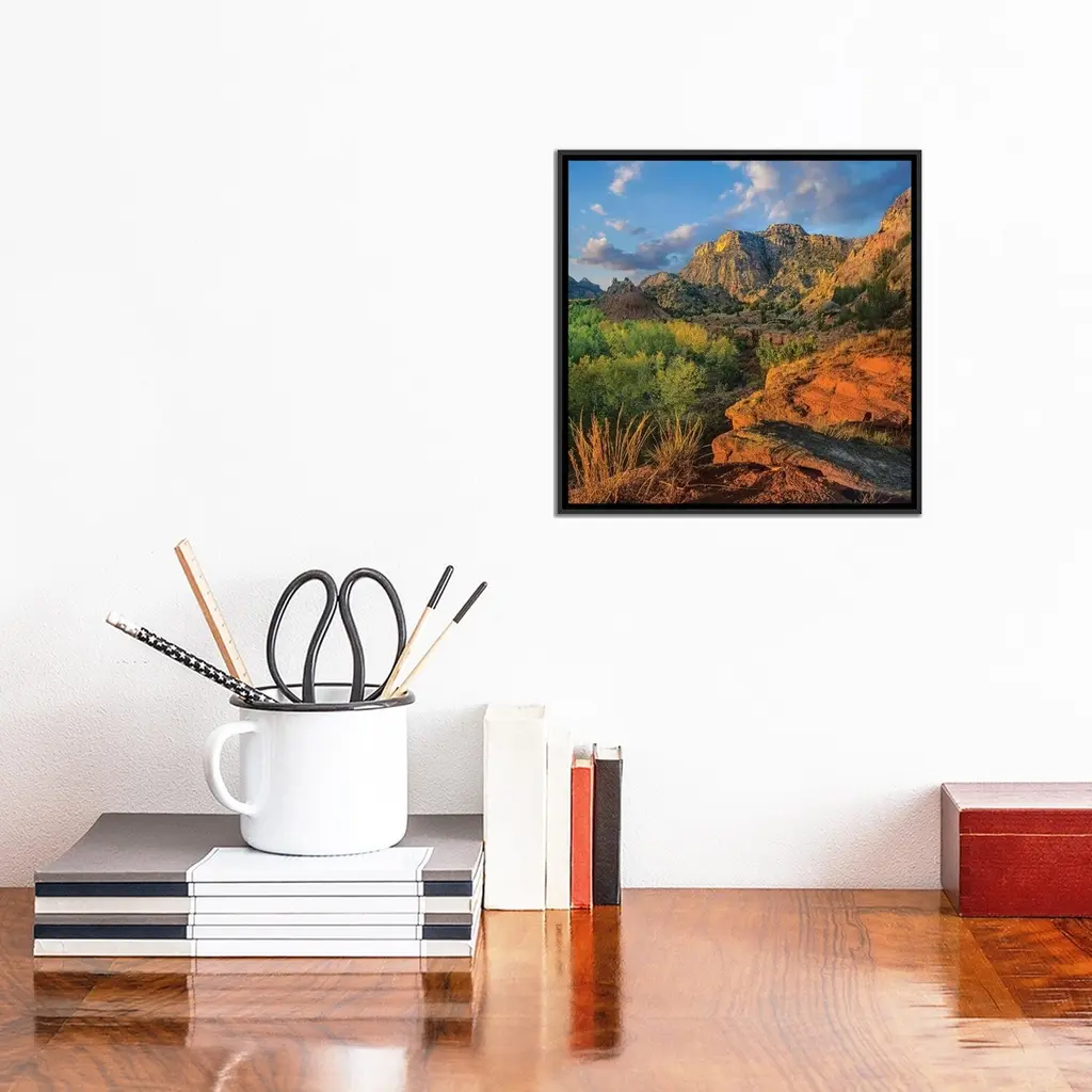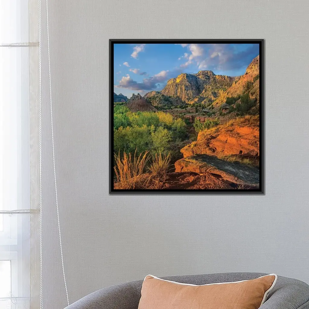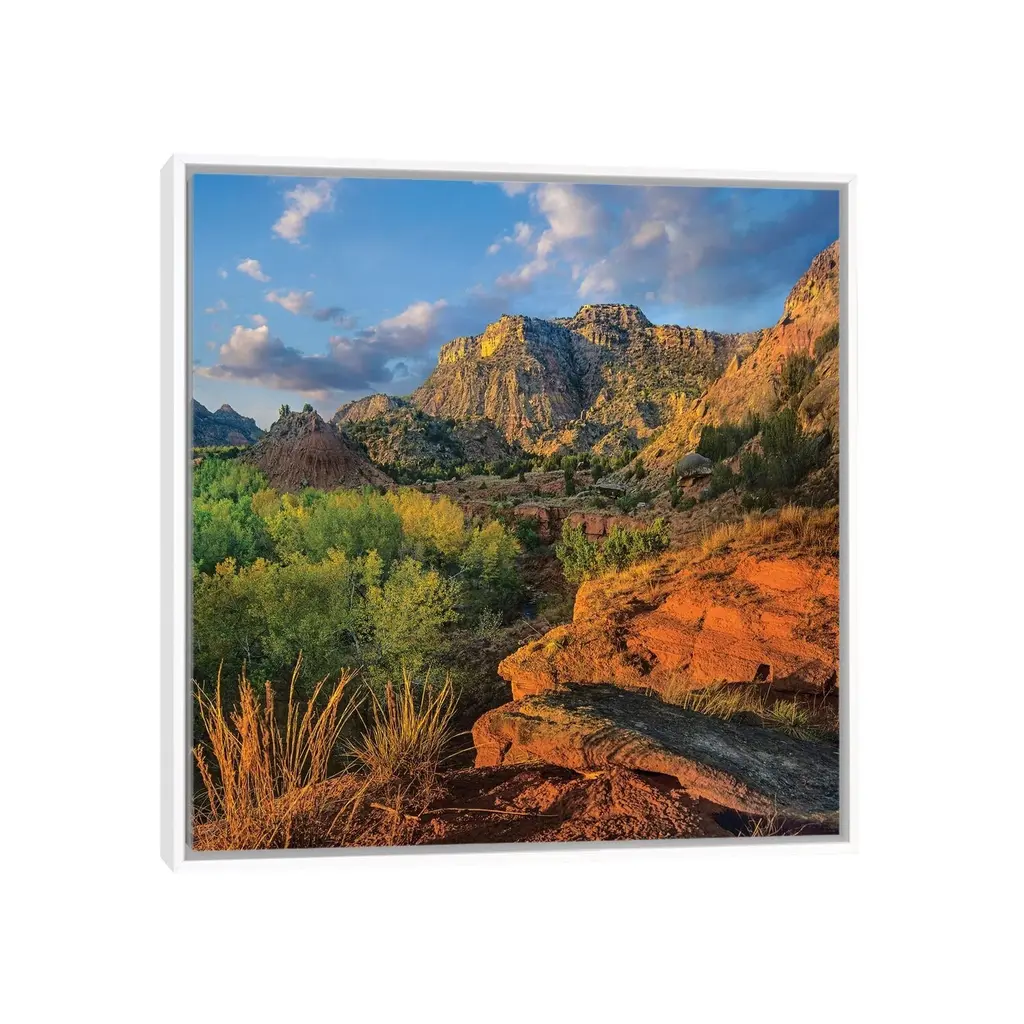 Icanvas "Cottonwood Trees And Mountains, Palo Duro Canyon State Park, Texas" By Tim Fitzharris Framed Canvas Print - Black - 12x12