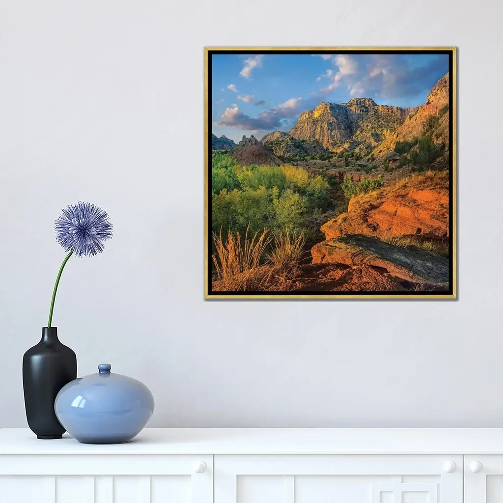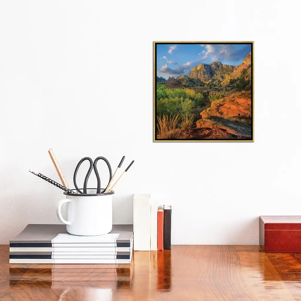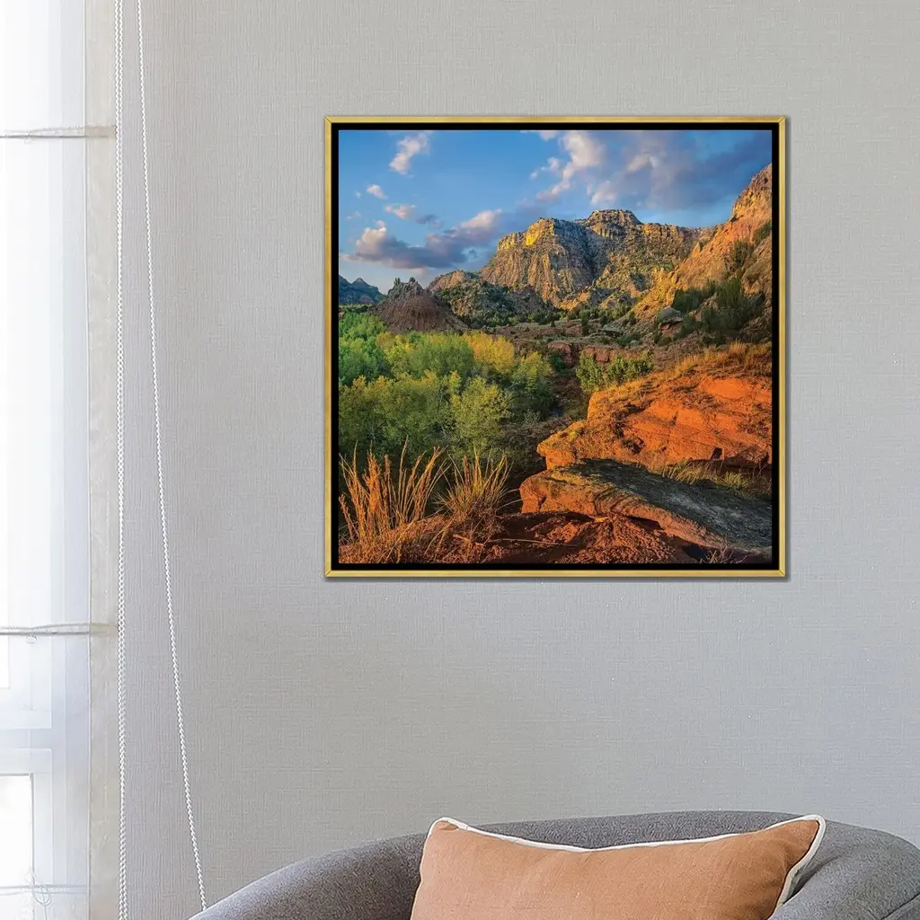 Icanvas "Cottonwood Trees And Mountains, Palo Duro Canyon State Park, Texas" By Tim Fitzharris Framed Canvas Print - Black - 12x12
