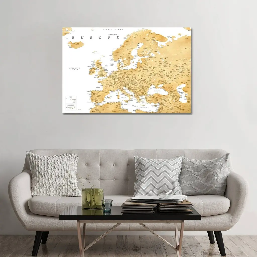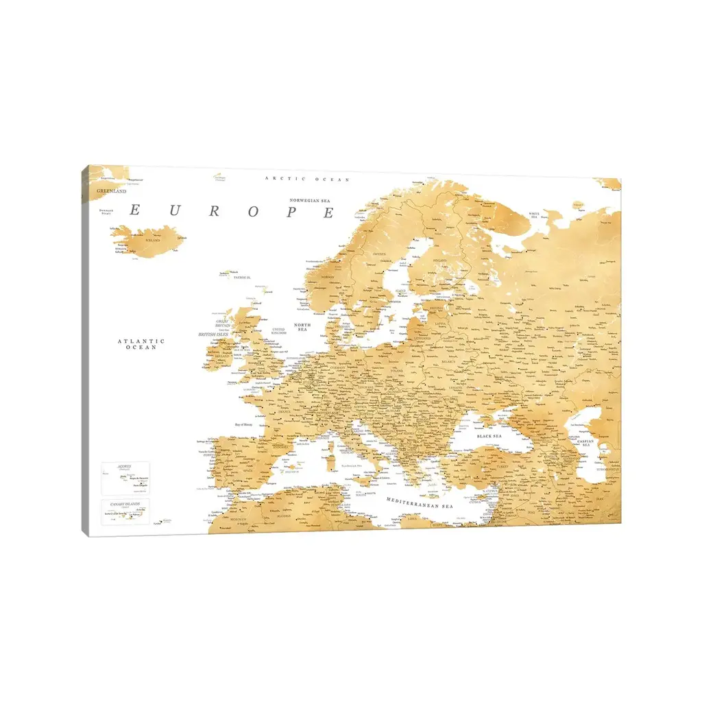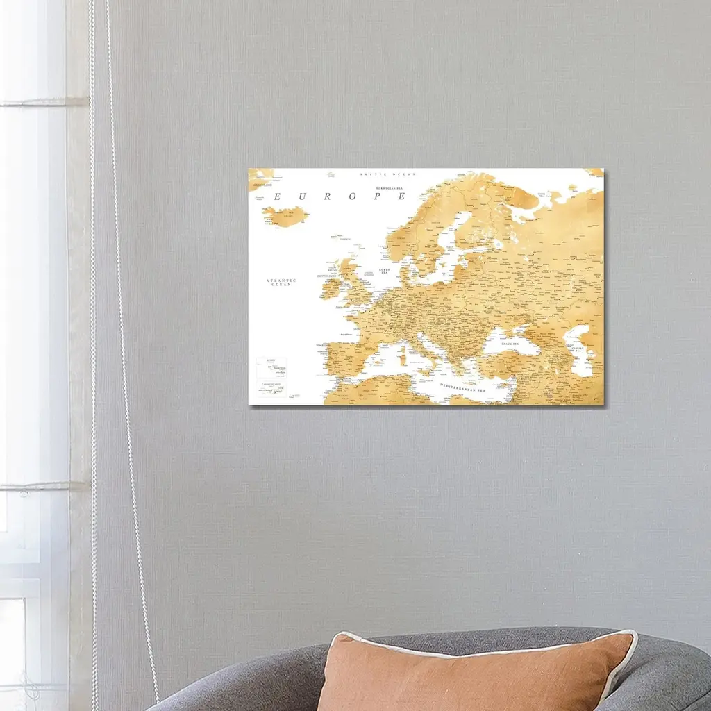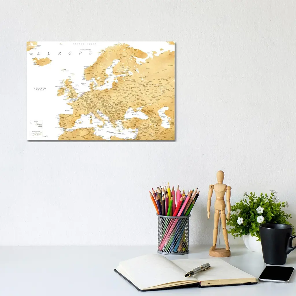 Icanvas "Detailed Map Of Europe In Gold Ochre" By Blursbyai Canvas Print - 18x26x1.5