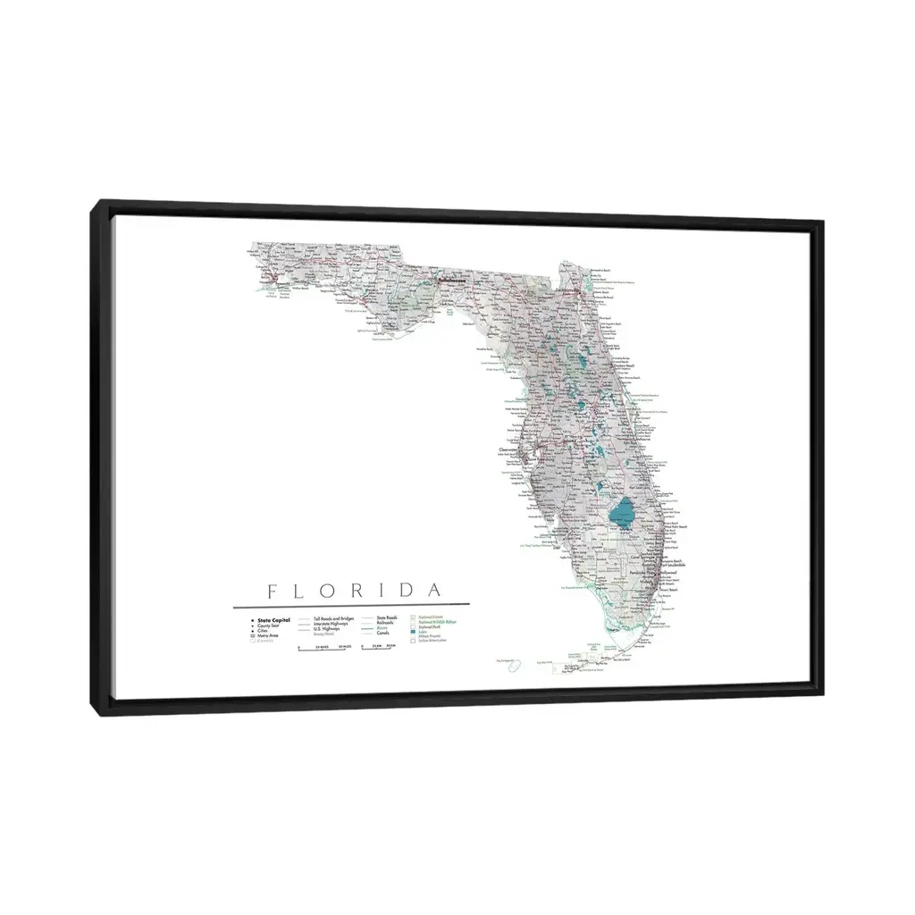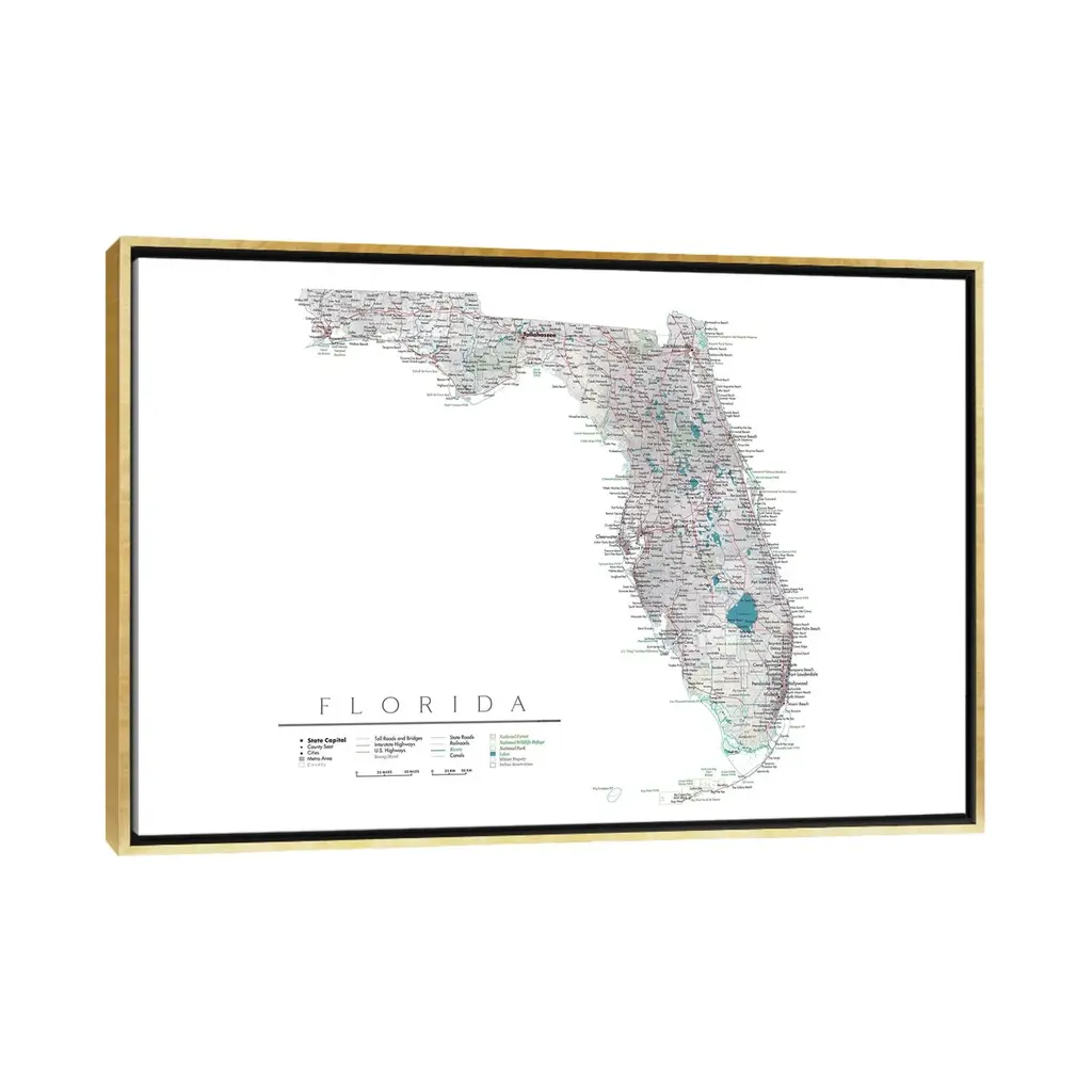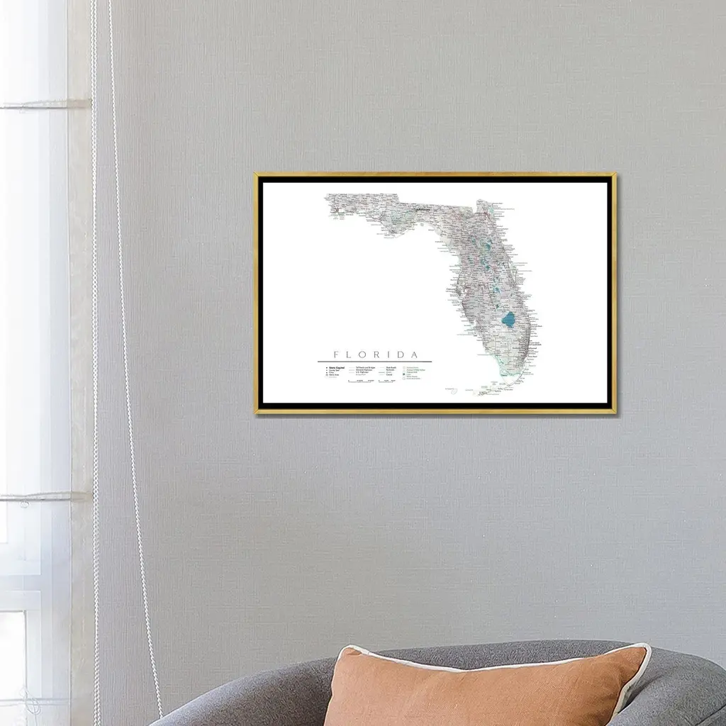 Icanvas "Detailed Map Of Florida, Usa" By Blursbyai Framed Canvas Print - Black - 26x40