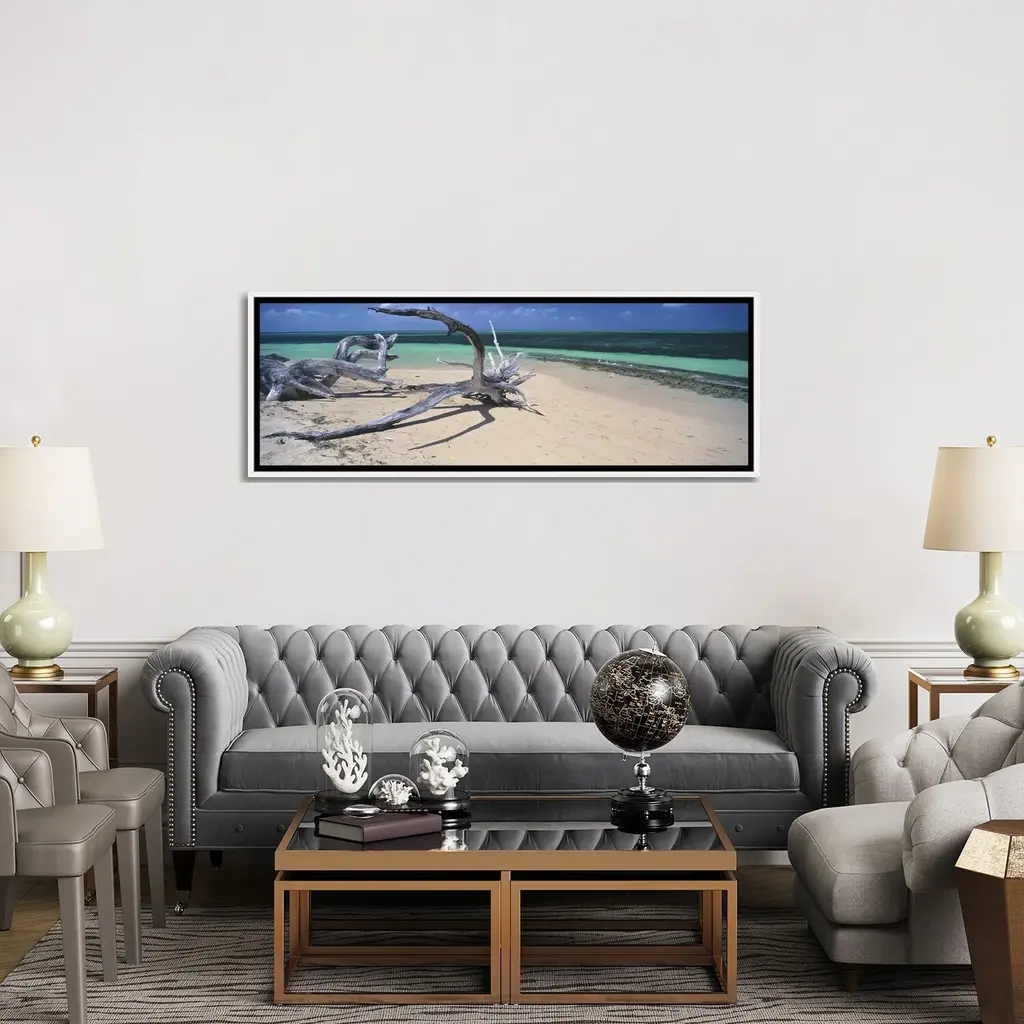 Icanvas "Driftwood On The Beach, Green Island,great Barrier Reef, Queensland, Australia" By Panoramic Images Framed Canvas Print - 20x60 - White