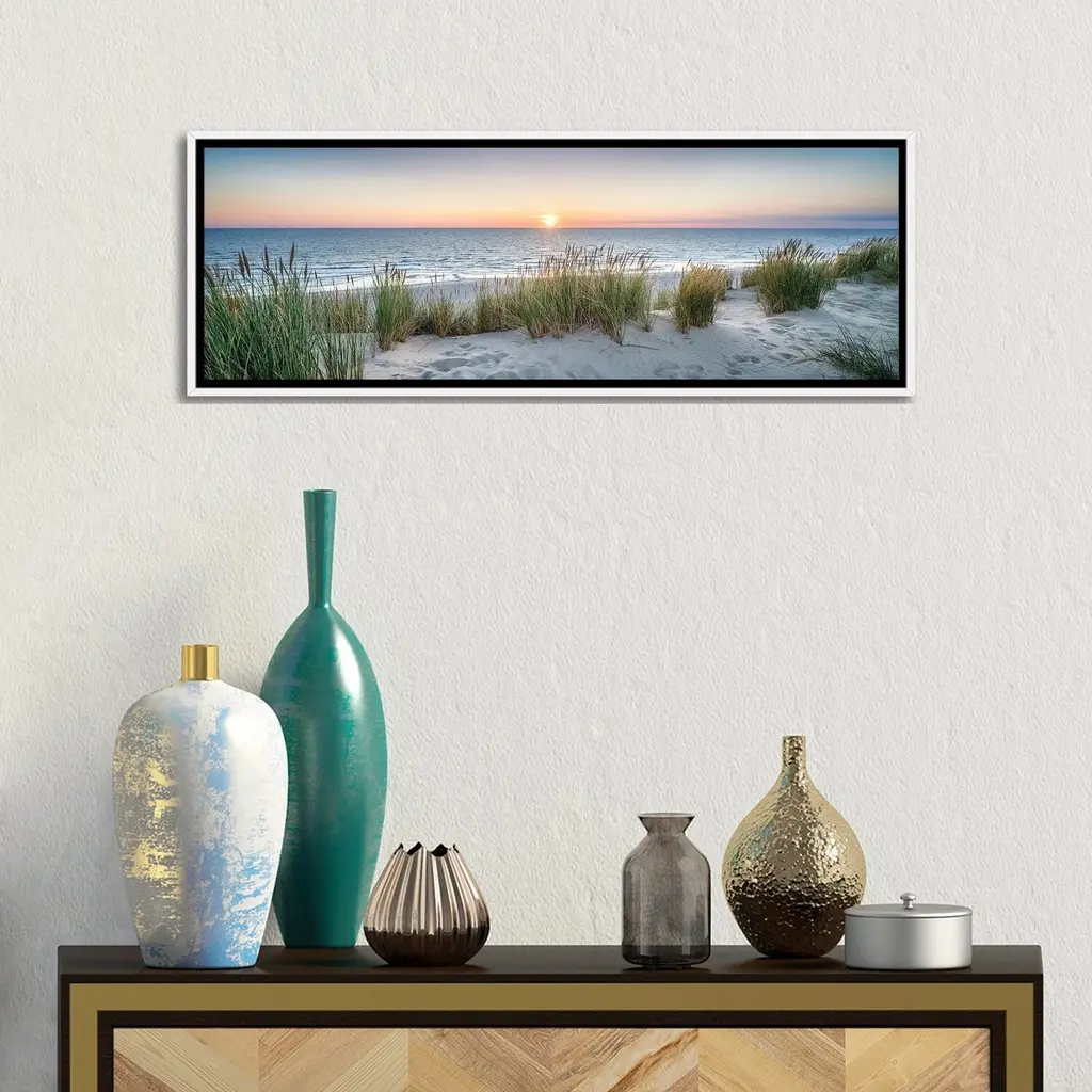 Icanvas "Dune Beach Panorama At Sunset" By Jan Becke Framed Canvas Print - 12x36 - White