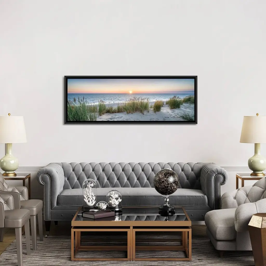 Icanvas "Dune Beach Panorama At Sunset" By Jan Becke Framed Canvas Print - 20x60 - Black