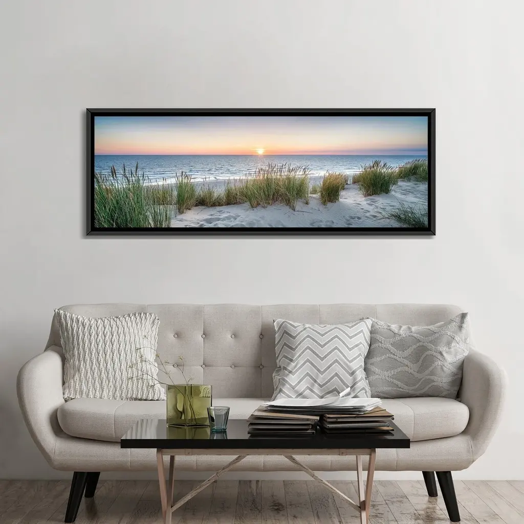 Icanvas "Dune Beach Panorama At Sunset" By Jan Becke Framed Canvas Print - 24x72 - Black
