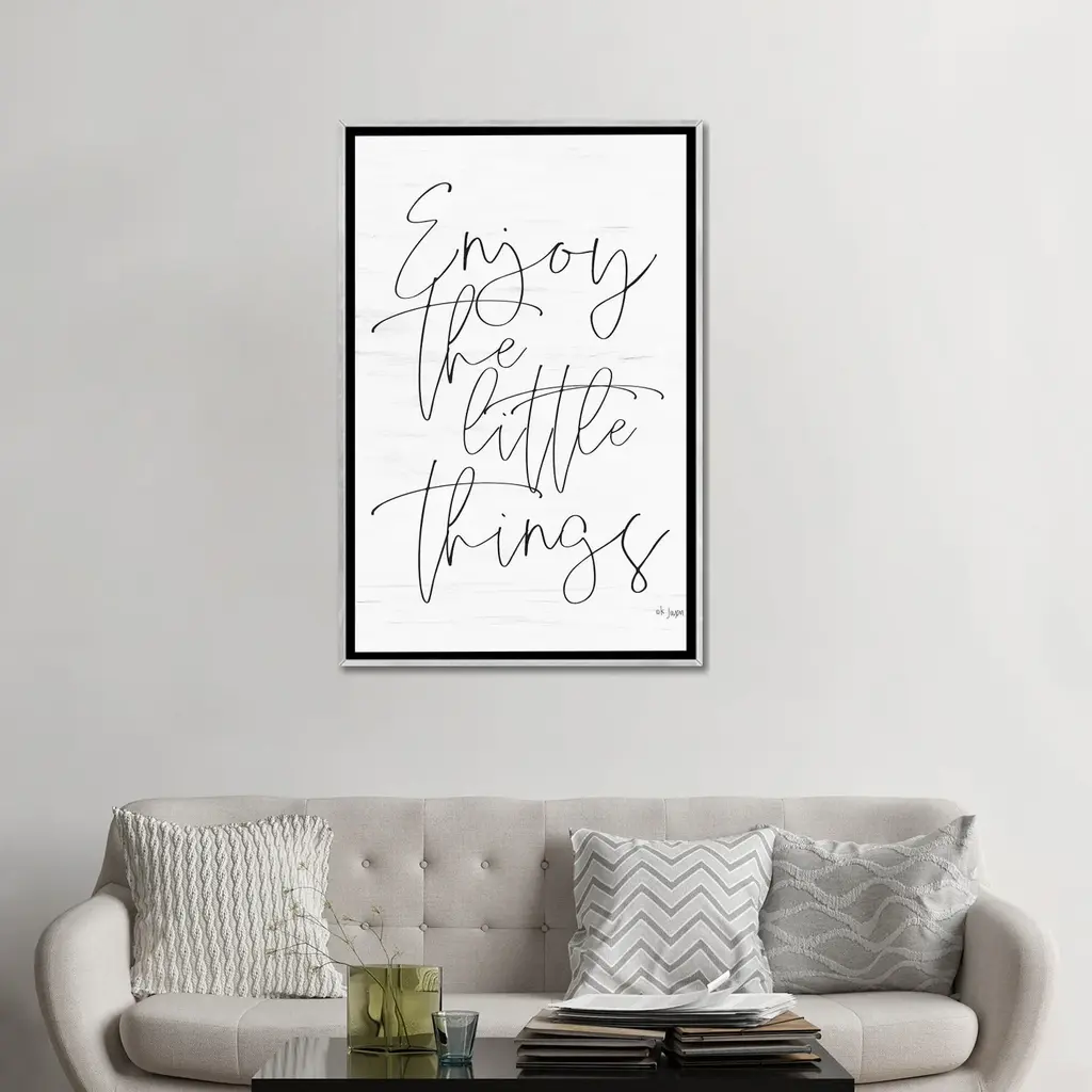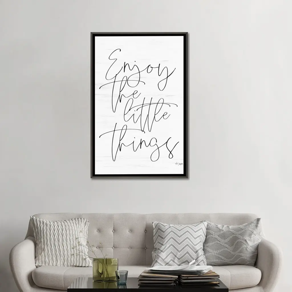 Add a touch of elegance and inspiration to your space with the iCanvas "Enjoy The Little Things" by Jaxn Blvd. Framed Artwork. This high-quality Giclee canvas artwork is made in the USA, offering the texture, look, and feel of a fine-art painting. It is crafted with artist-grade canvas, professionally hand-stretched and stapled over North American pine-wood bars in a Gallery Wrap style. The artwork comes mounted to a 2-inch thick, elegant hard wood frame, with a "floating" illusion created by the inset design. The fade-resistant archival inks ensure vibrant color reproduction that lasts for decades, even in strong light. Elevate your decor with this contemporary and uncompromising piece!Features: