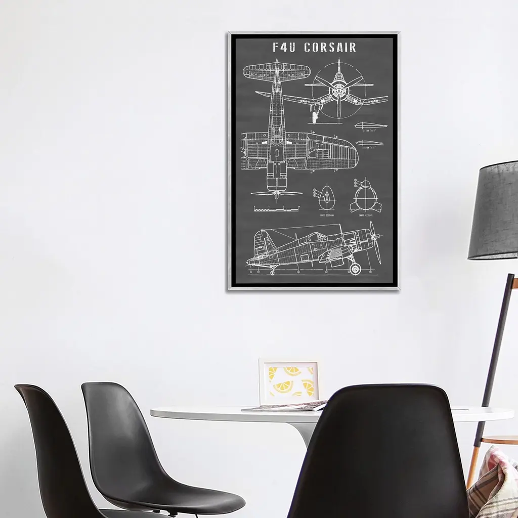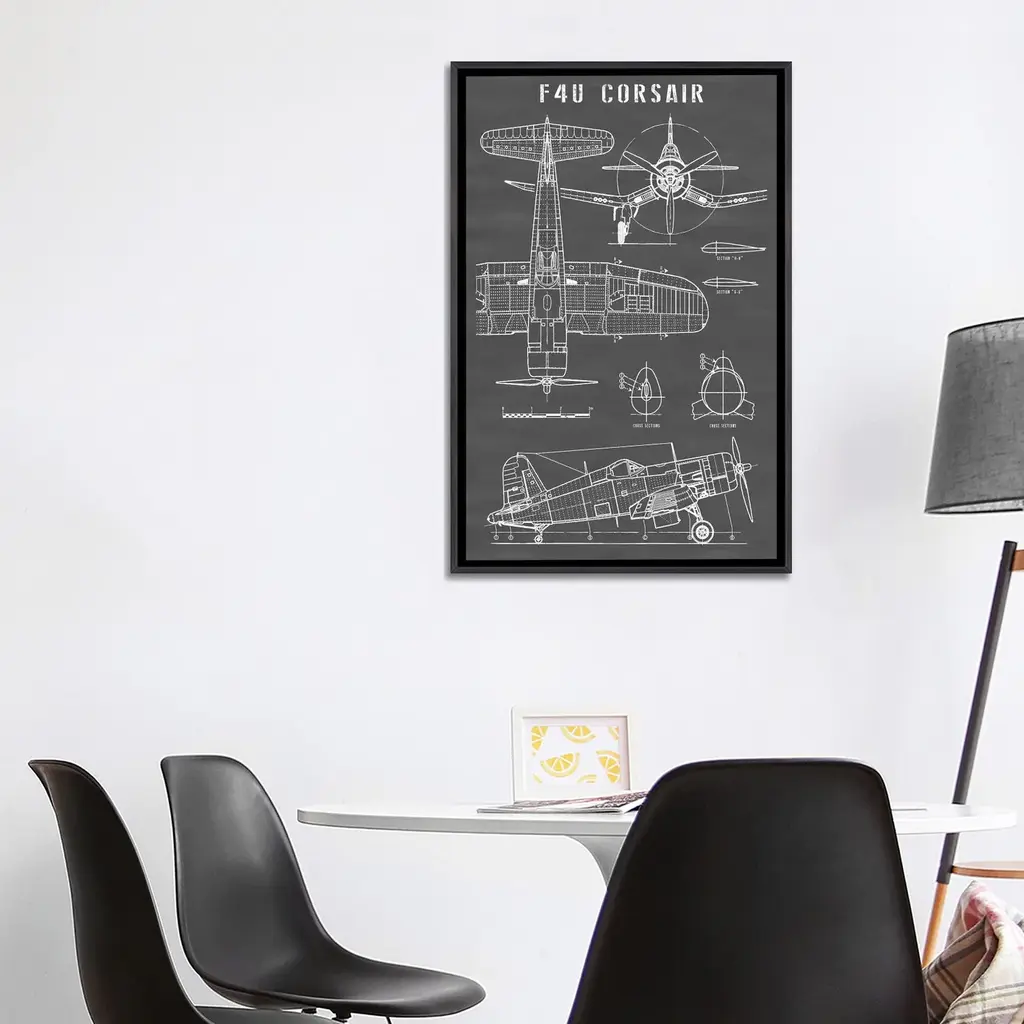 Icanvas "F4u Corsair Vintage Navy Airplane Black" By Action Blueprints Framed - Ebony - 26x18