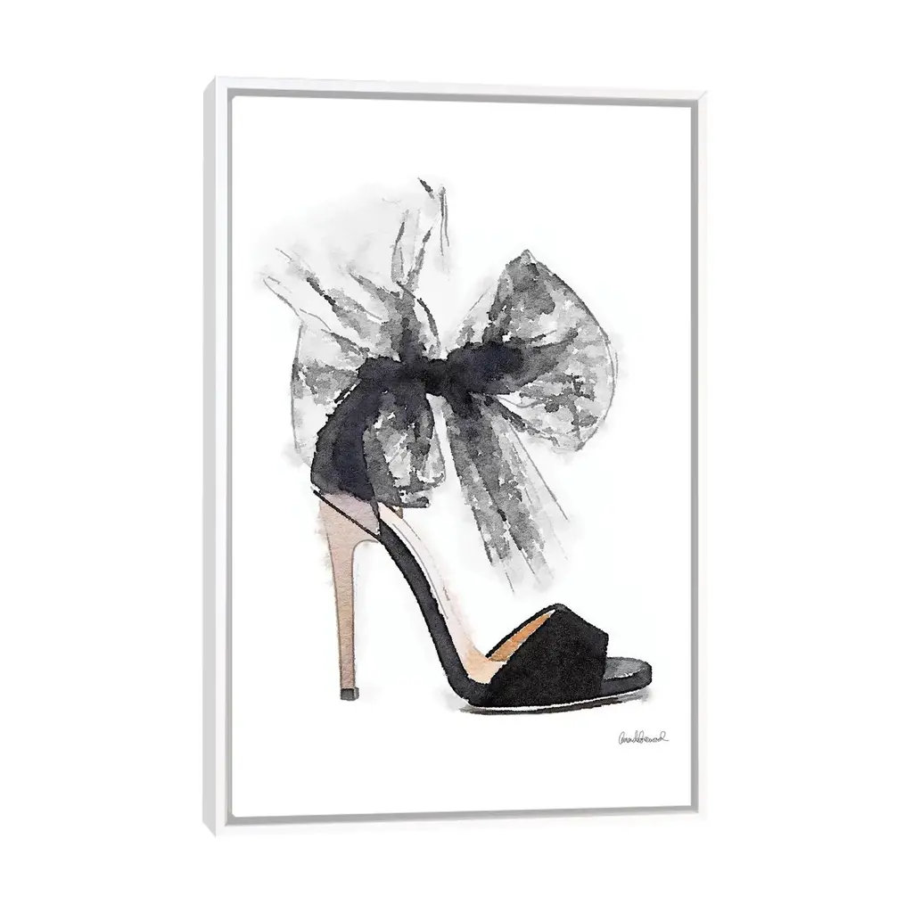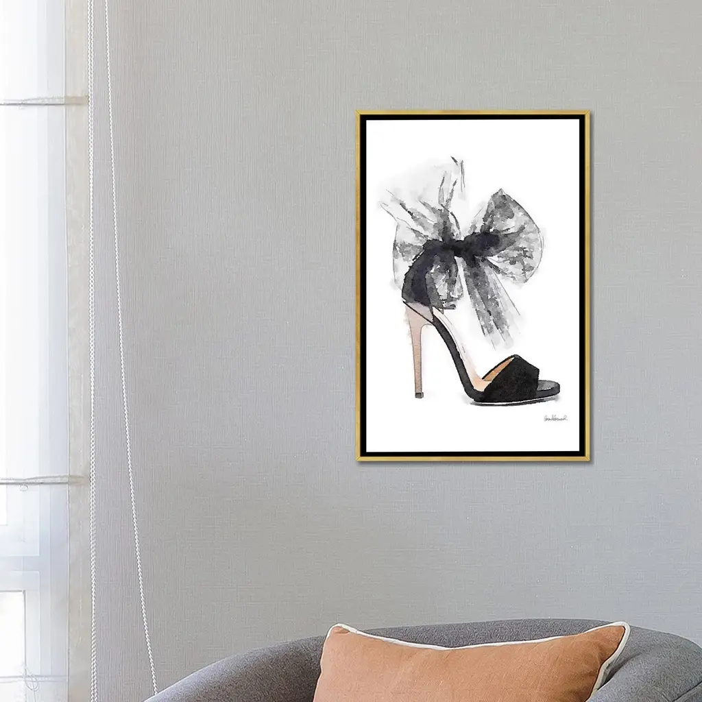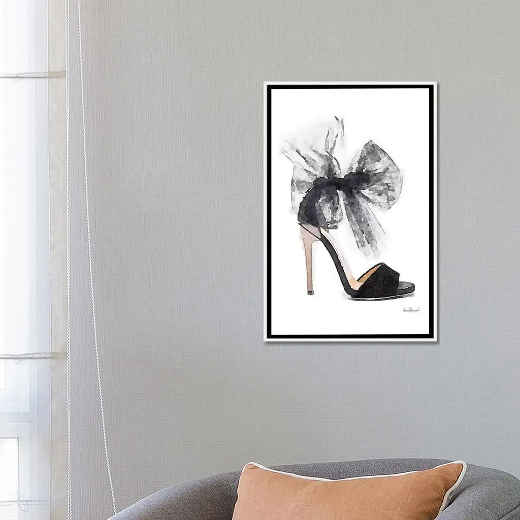 Elevate your space with the iCanvas "Fashion Shoe In Black Sheer" by Amanda Greenwood Framed Canvas Print. Made with artist-grade canvas, this gallery-wrapped artwork offers the texture and feel of fine-art paintings. Professionally hand-stretched and stapled over North American pine-wood bars, it showcases a contemporary and uncompromising style. The fade-resistant archival inks ensure vibrant color reproduction that lasts for decades, even under strong light. Mounted to a 2-inch thick, elegant hardwood frame, the art appears to float, creating a captivating illusion. Transform your space with this high-quality and visually stunning canvas print.Features:
